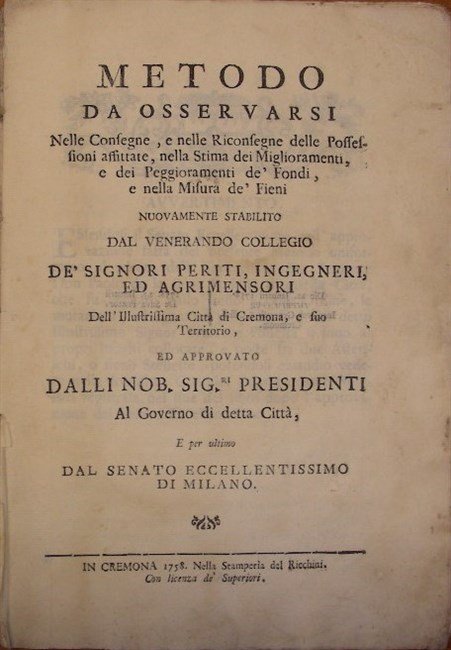 METODO DA OSSERVARSI nelle consegne, e nelle riconsegne delle Possessioni affittate, nella Stima dei Miglioramenti, e dei Peggioramenti de’ Fondi, e nella Misura de’ Fieni. Nuovamente stabilito dal venerando Collegio de’ Signori Periti, Ingegneri, ed Agrimensori dell’Illustrissima Città di Cremona, e suo territorio.
