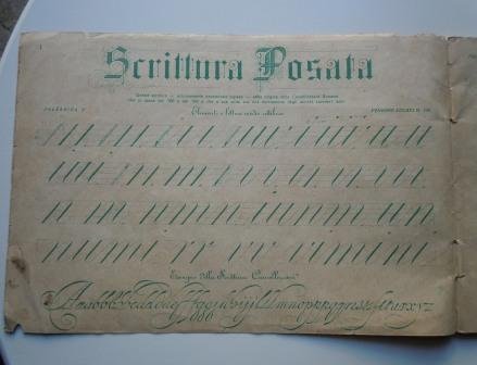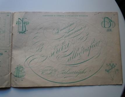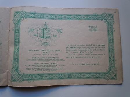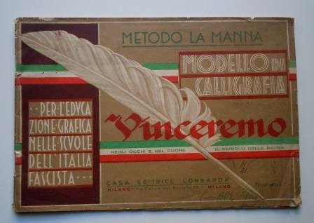 Milano, Casa editrice Lombarda, stampa Fratelli Bombelli; bella copertina cromatica con il motto: "Vinceremo. Negli occhi e nel cuore il simbolo della patria". Legatura punto metallico, cm 25 x 17; 43 tavole di esempi, con istruzioni e uso dei pennini. Integro, ben conservato