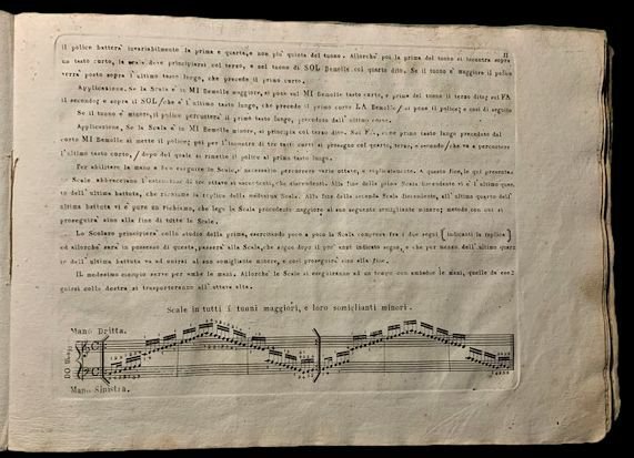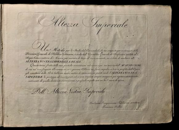 In oblungo (35,7×25,7 cm) 84, (4) pp. Legatura coeva in mezza pergamena con piatti foderati con carta marmorizzata coeva. Qualche foglio un po lento ma nel complesso esemplare in buone condizioni di conservazione completo delle ultime 4 pagine, spesso assenti nelle quali, in alcuni esemplari, come quello presentato, è presente lelenco completo dei sottoscrittori. Prima rara edizione di questo celeberrimo metodo per clavicembalo, considerato il primo trattato italiano per lo studio del clavicembalo, opera del noto musicista, compositore e docente milanese ma nato a Lubiana, Francesco Pollini (Lubiana, 1762 Milano, 1846). Pollini studiò musica a Vienna ed ebbe fra i suoi maestri anche Mozart che infatti, dedicò a Pollini uno dei suoi rondò per violino. Dopo aver perfezionato gli studi tornò a Milano dove iniziò lattività di musicista e di didatta divenendo, ben presto, molto apprezzato e ricercato fino a raggiungere la carica di professore di composizione al prestigioso Conservatorio di Milano. Grande amico di Bellini che gli dedicò lopera La Sonnambula, fu autore di diverse composizioni ma fu proprio il suo metodo pel clavicembalo che qui presentiamo, a dargli imperitura fama. Dopo questa prima edizione del 1812 edita per i soli sottoscrittori, lopera vide poi diverse ristampe a partire dal 1834, data della seconda edizione. Quella che qui presentiamo è la rara prima edizione che vede alla fine del volume le 4 pagine non numerate, spesso assenti che contengono, non solo, lindice delle materie (Della posizione del corpo, Della tastiera, Degli attributi della mano, Della maniera di studiare in generale, Del portamento della mano in generale, Delle scale i generale, Del portamento della mano in generale ecc.) ma in alcune copie, come questa, linteressantissimo elenco dei sottoscrittori che ben rappresenta le conoscenze e la fama di Pollini. Si leggono fra i nomi: Bonifazio Asioli, Ferdinando Artaria (che ne commissionò 16 copie), il maestro di Cappella di Correggio Giovanni Asioli, il triestino Adolfo Bassi noto Maestro di Musica, Carolina Belgiojoso, Antonio Carlotti il cimbellano di Sua Maestà il Re dItalia Eugenio Napoleone, il Conte Giovanni Battista Forni di Modena, Michele Fusco maestro di Cappella di Modena, i nobili modenesi Antonio Gandini e Enea Montecuccoli, Gataudé A. di Parigi Maestro particolare della Musica dellimperatore che fu autore di un noto nuovo metodo di canto, Pompeo Litta, Angelo Lodi di Ferrara Maestro di Musica ed Accademico Filarmonico di Bologna, Simone Mayr Maestro di Cappella di Bergamo e Carlo Mozart musicista e secondogenito di Wolfgang Mozart. Di questa prima edizione, si sa, appunto dallelenco dei sottoscrittori che citano anche il numero di copie richieste, che vennero stampate circa 400 copie molte delle quali, oggi sono andate disperse e distrutte, facendo di questa prima edizione, unopera assai rara. Per capre limportanza della figura di Pollini nel panorama musicale italiano dellinizio del secolo, vogliamo citare le parole di Bianca Maria Antolini espresse, durante un ciclo di convegni dedicati alla figura di Pollini dal titolo Francesco Pollini e il mondo musicale milanese del primo ottocento: Nel febbraio 1812 Peter Lichtenthal nell«Allgemeine Musikalische Zeitung», annunciando limminente pubblicazione del Metodo pel clavicembalo di Pollini, si soffermava sulle accademie musicali che si tenevano nella sua casa. Erano gli anni in cui laristocrazia, di cui spesso facevano parte anche musicisti dilettanti, apriva le porte delle proprie residenze a incontri musicali: pensiamo alle riunioni nelle case Balzaretti, Caimi, Moller, alle quali Lichtenthal spesso partecipava facendo eseguire sue composizioni e di cui forniva notizie (non sempre lusinghiere, è da dirsi, dal momento che gli esiti artistici di questi incontri a volte erano piuttosto incerti). Oppure a quelle più avanti nel tempo e più prestigiose in casa del conte Cesare di Castelbarco, nel famoso e molto ben frequentato salotto di Paolo Branca e delle sue talentuose figlie, presso Gustavo Adolfo Noseda oppure negli eventi musical-letterari organizzati dalla contessa Guglielmina Durini Litta Biumi Resta. Oltre a ciò, val la pena considerare pure i più semplici e meno formali incontri musicali, raramente documentati ma che si possono dedurre dalle corrispondenze, che non avevanocome scopo finale lesibizione ma davano risposta al desiderio e al piacere di fare musica insieme. A questo fervore musicale non era naturalmente estraneo Pollini che, oltre ad essere musicista affermato, era detentore di un titolo nobiliare, quello di barone, concesso a suo padre da Maria Teresa dAustria. La lunga lista delle sue aristocratiche allieve si ritrova nellelenco dei dedicatari delle sue composizioni e da questi nomi ha preso spunto la ricerca alla base della relazione che viene presentata. Sempre durante questa serie di convegni incentrati sulla figura di Pollini, Leonardo Miucci, ben tratteggiò limportanza dellopera di Pollini Francesco Pollini ha rappresentato la figura più importante fra i pianisti attivi a Milano e in Italia nel primo Ottocento. Sebbene non abbia mai praticato linsegnamento presso il Conservatorio di Milano, nel 1811 gli venne commissionato dalla neonata istituzione il compito di redigere un metodo per listruzione delle classi di pianoforte. La prima edizione del Metodo pel Clavicembalo è stata pubblicata da Ricordi nel Febbraio del 1812 e una seconda edizione conoscerà le stampe nel 1834 [con un numero di pagine differenti]. Questo trattato, il primo interamente dedicato al pianoforte in Italia e in italiano, ha esercitato una lunga e importante influenza nel panorama pianistico italiano fino al termine del XIX secolo, ricevendo altresì uneco internazionale, soprattutto nei paesi di lingua tedesca. I suoi contenuti sono in qualche misura influenzati dalla tradizione tastieristica francese (quella di Adam, in particolare) comprensibile se si considera il contesto pol