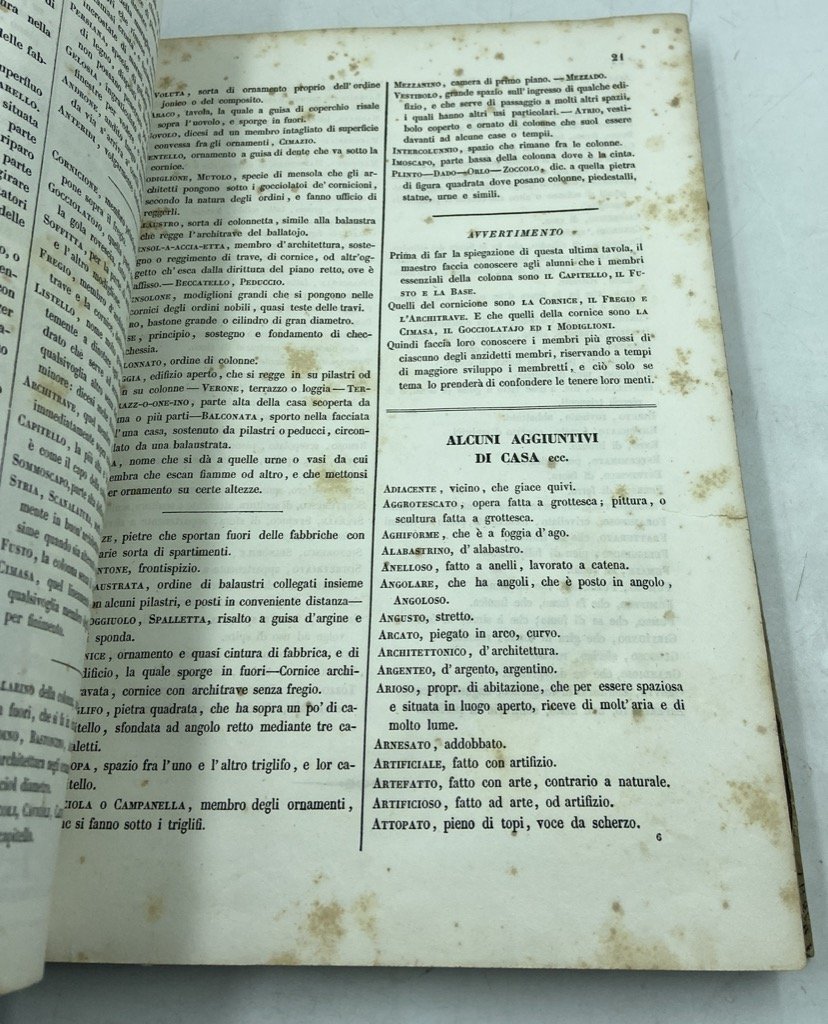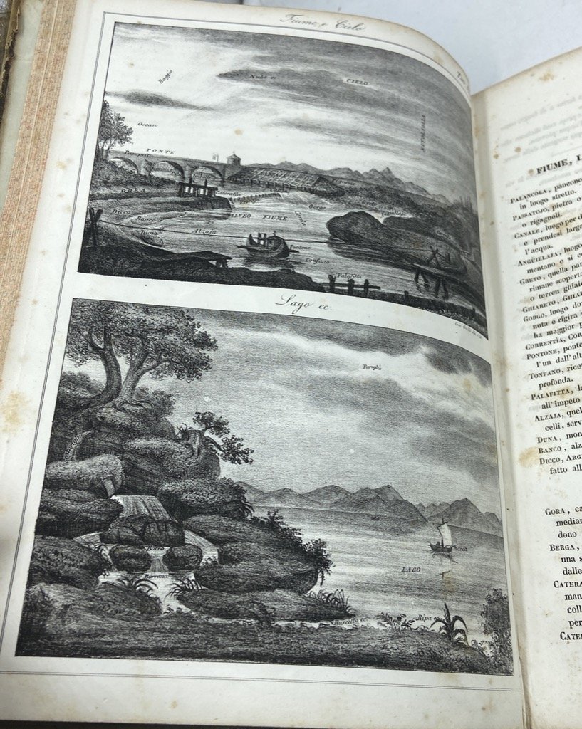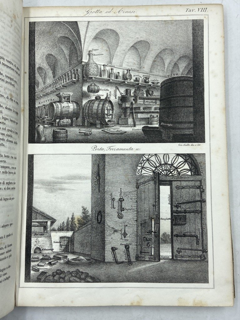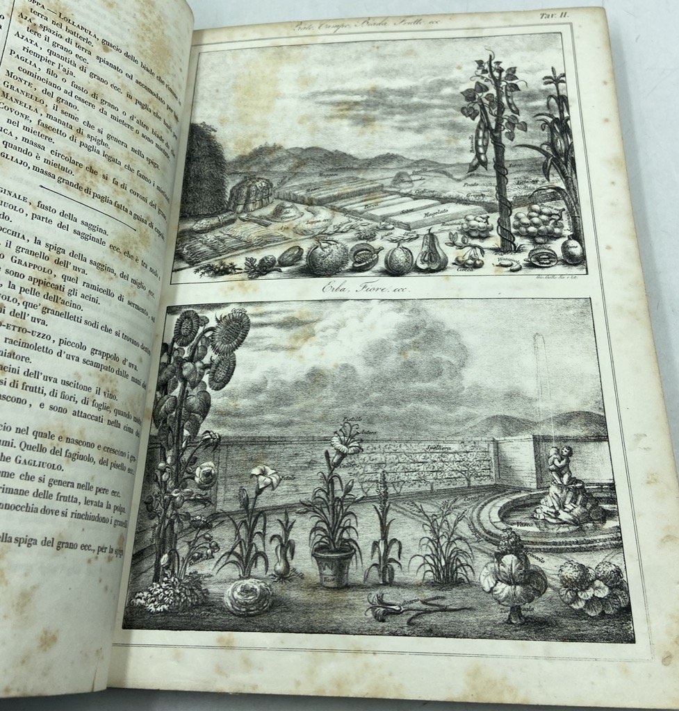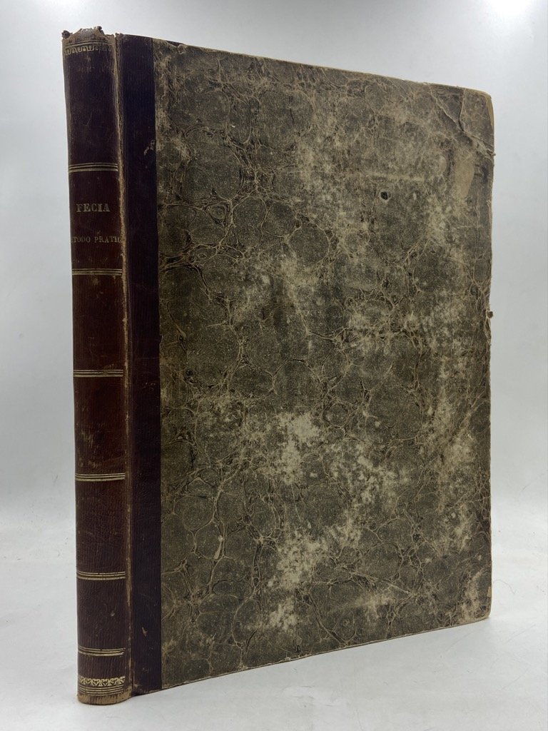 Un volume in quarto cm 31 x 22, legatura coeva in mezza pelle, pp 203 (1) con 26 tavole litografiche disegnate da Giovanni Gallo e impresse da Doyen. Discreto esemplare. Tracce di ex libris sulla prima sguardia, iniziali timbrate sulla sguardia e al verso del frontespizio, abituali fioriture sparse come tipico di quest’opera, peraltro in questo esemplare piuttosto contenute; fessura parziale d’una cerniera, legatura leggermente allentata, crepa su un angolo del piatto anteriore. Curiosa opera didattica del sacerdote biellese Agostino Fecia, insegnante e pedagogo impegnato sin dagli esordi nella diffusione della lingua italiana presso le classi popolari piemontesi. La sua esperienza nelle scuole rurali lo portò a sviluppare un metodo d’insegnamento che faceva largo uso di ausili grafici su tabelloni, per illustrare la nomenclatura italiana e vincere l’ostacolo del dialetto; l’esperienza fu all’origine di questo Metodo, opera che, insieme al successivo Ajutarello a parlare familiarmente italiano (1841) e al perfezionato Direttorio per insegnare fruttuosamente la lingua italiana ed altre lingue (1842), portò all’autore una certa fama nell’ambiente della pedagogia, tanto che nel 1845 si trasferì a Torino, dove assunse la direzione de “L’Educatore Primario” e aprì con la sorella una scuola privata per maestre. (Cfr Chiosso, in Dizionario Biografico dell’Educazione, sub voce). Il Metodo è riccamente illustrato con 26 tavole di gusto popolare: scene e ambienti della vita quotidiana e del lavoro nelle campagne, cantine, cucine… immagini affollatissime di personaggi, animali e attrezzi, in una surreale messa in scena tra la naïveté dell’ex voto e l’astrazione dell’illustrazione scientifica che oggi costituiscono un peculiare documento della cultura materiale dell’epoca.