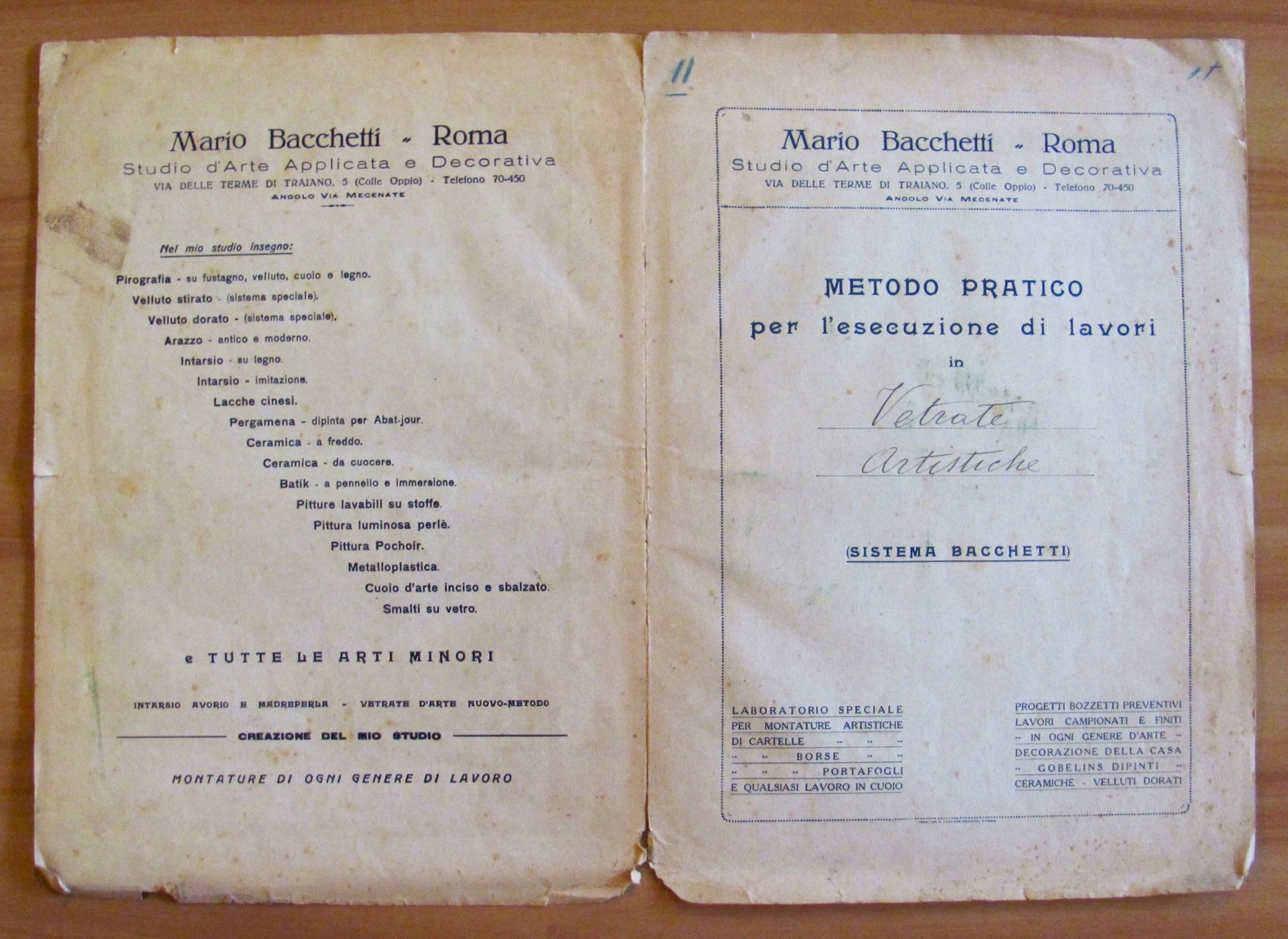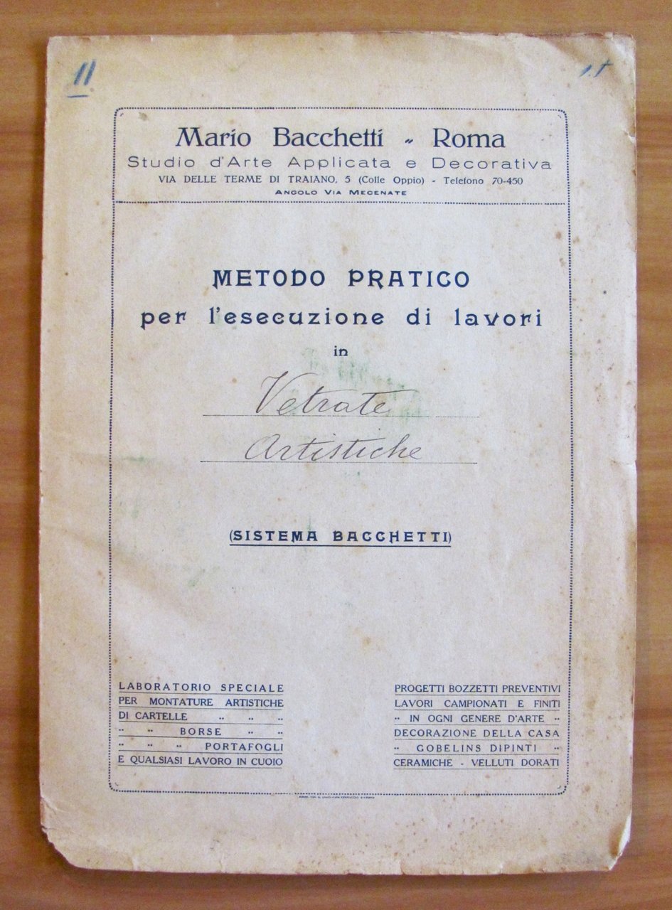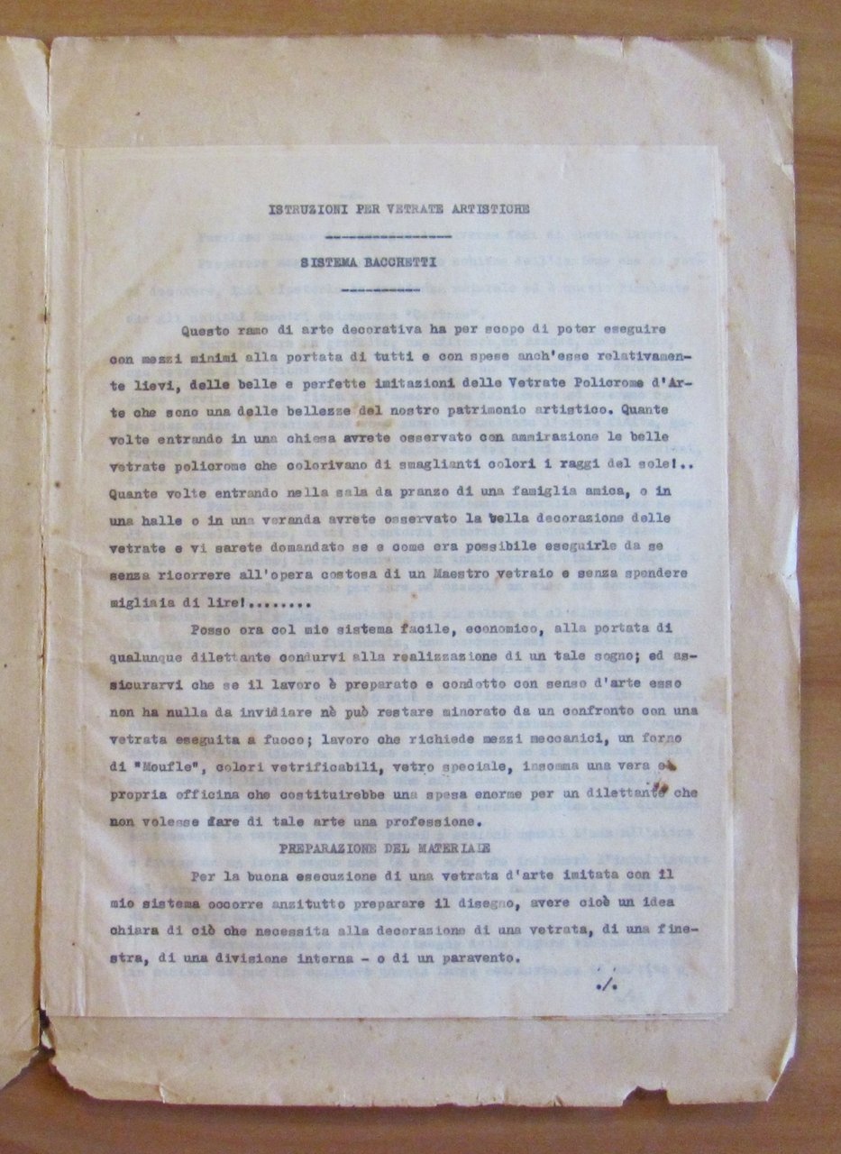 Istruzioni per l'esecuzione di Vetrate in piombo e per la Pittura delle stesse. Studio d'Arte Bacchetti - Roma, s.d. anni '20. Cartellina originale con lievi tracce del tempo. 24,5x35; pp.12 non numerate. Raro dattiloscritto mai pubblicato in Buonissimo stato. , Molto buono (Very Good)