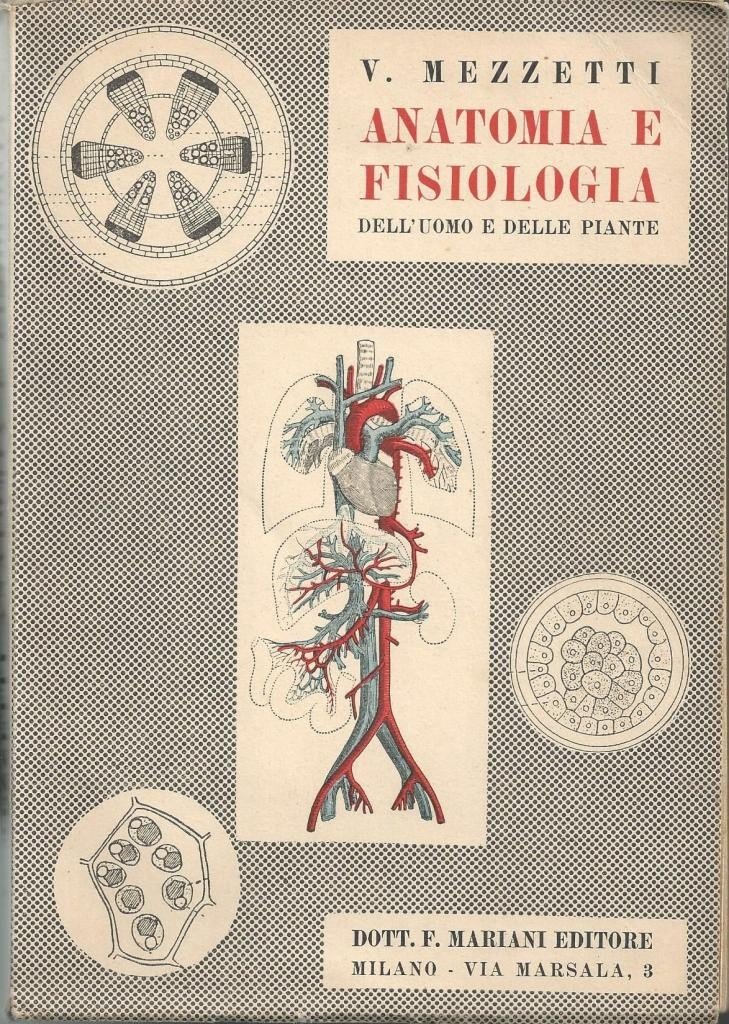 Valeria Mezzetti, Nozioni di anatomia e fisiologia dell’uomo e delle piante. Con elementi di igiene. Per le scuole medie superiori, Dott. F. Mariani Editore, Milano 1951, pp. 318, ill. b.n., cm 21, br. ed. Firma d’appartenenza alla prima carta bianca. Leggere tracce d’uso, uniforme ingiallitura della carta, ma nel complesso buona copia.
