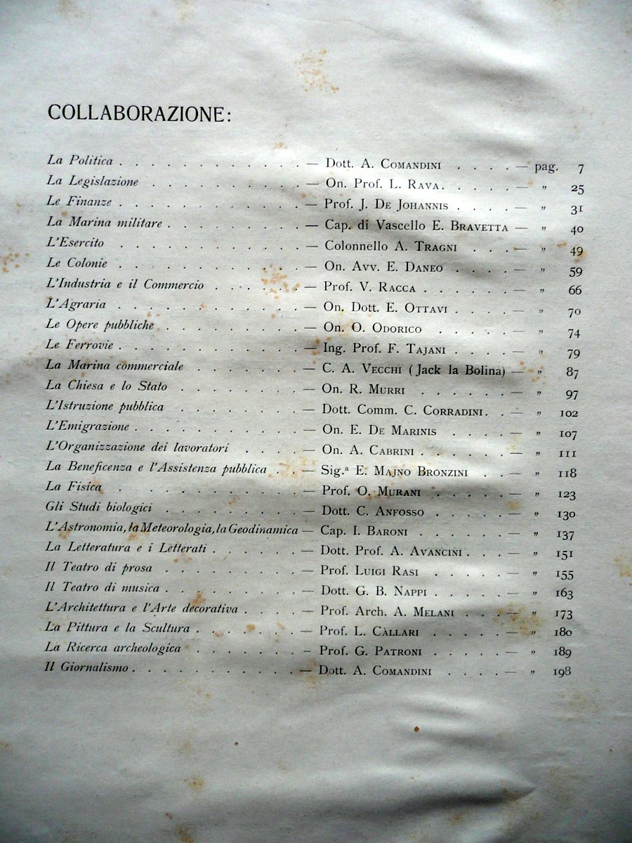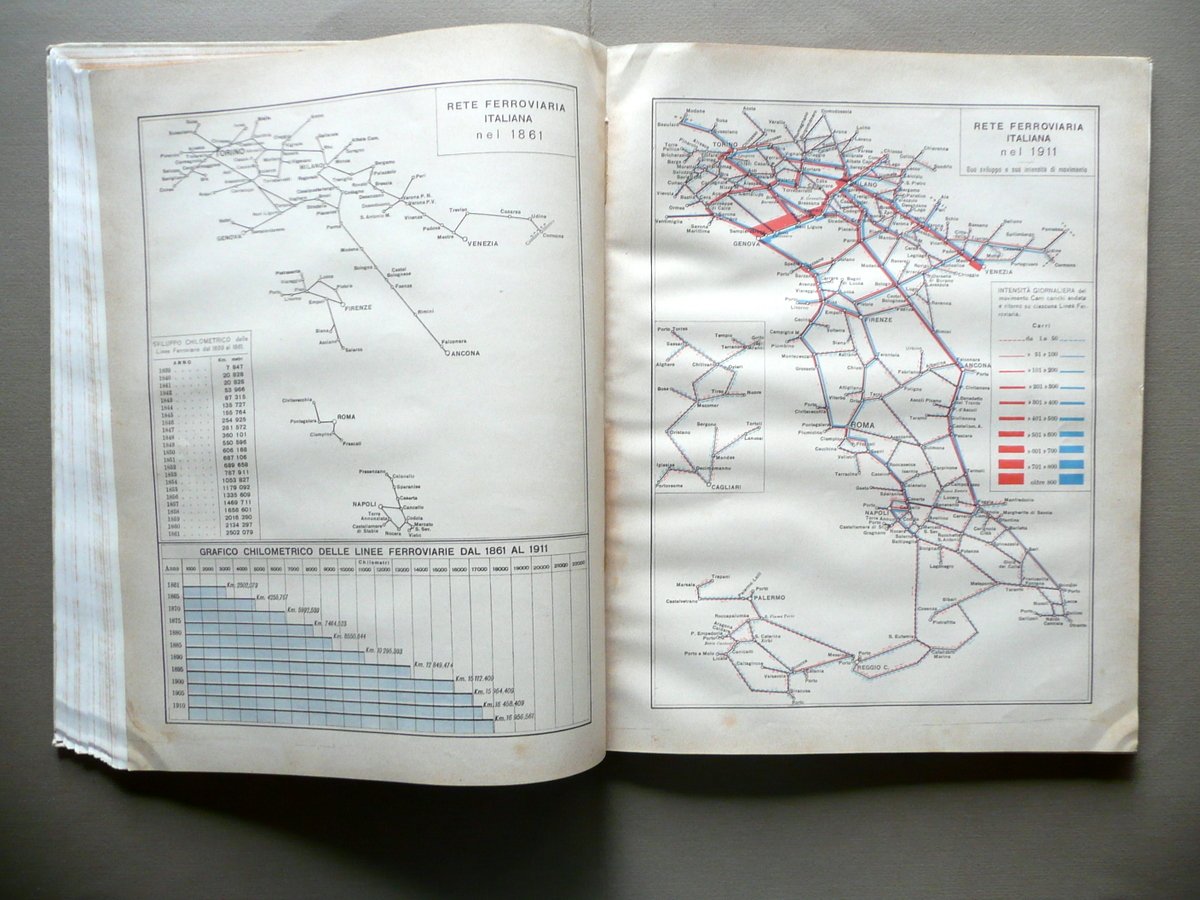 AA. VV., Mezzo Secolo di Vita Italiana 1861 - 1911 Vallardi, Milano 1911; cm 36,5x28,5; pp. 216 con numerose ill. in b/n nel t. e fuori t., e con qualche tavola a colori fuori t.; tutta tela ed. con titolo impresso al piatto ant.; bella grafica a colori. Condizioni di conservazione Esemplare ben conservato con tracce d'uso, coperta con leggere tracce di sporco e qualche lieve alone; margine e cuffia sup. del volume con circoscritta poco visibile ombra di gora che non interessa il testo o le illustrazioni. Interni buoni con alcune piccole leggere bruniture. Ampia rassegna sui progressi, scoperte, opere realizzate durante i primi 50 anni di costituzione del Regno d'Italia in campo tecnico - scientifico, letterario, artistico ecc. (vedi foto indice). SETT81.L13931 N