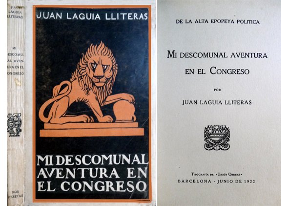 Barcelona, Tipografía de "Unión Obrera", Junio de 1922. 4to.; 125 pp., 1 h. Cubierta anterior original, pérdidas en la lomera, falto de cubierta posterior. Juan Laguía, redactor de "La Nación", se convirtió en el ideólogo principal y Secretario General de los contrarrevolucionarios "Sindicats Lliures", la Unión de Sindicatos Libres, organización creada en Barcelona, en Octubre de 1919, en el Ateneo Legitimista bajo el abierto patronazgo de la Patronal Catalana, la supervisión oculta de personajes eclesiásticos y militares como el Cardenal Soldevila y el General Martínez Anido, y presidida en sus inicios por Ramón Sales, requeté, procedente del Sindicato Mercantil de la CNT. En esta obra Laguía narra su prisión tras haber abofeteado a Indalecio Prieto en el Congreso de los Diputados.
