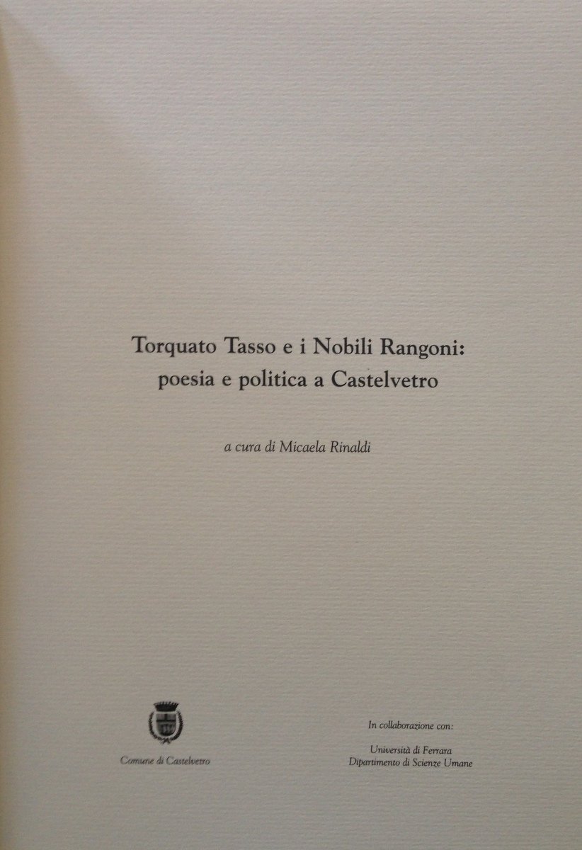 Micaela Rinaldi (a cura di), Torquato Tasso e i Nobili Rangoni: poesia e politica a Castelvetro Comune di Castelvetro 2003, cm. 30x21, pp. 152, br. ed. con cofanetto cart. ed. Condizioni di conservazione Esemplare in buono stato con leggere tracce d'uso; cofanetto editoriale con alcune macchie di sporco; brossura editoriale con minime abrasioni e poche minime macchiette di sporco, peraltro ottimo esemplare. SETT127.L12538 MT