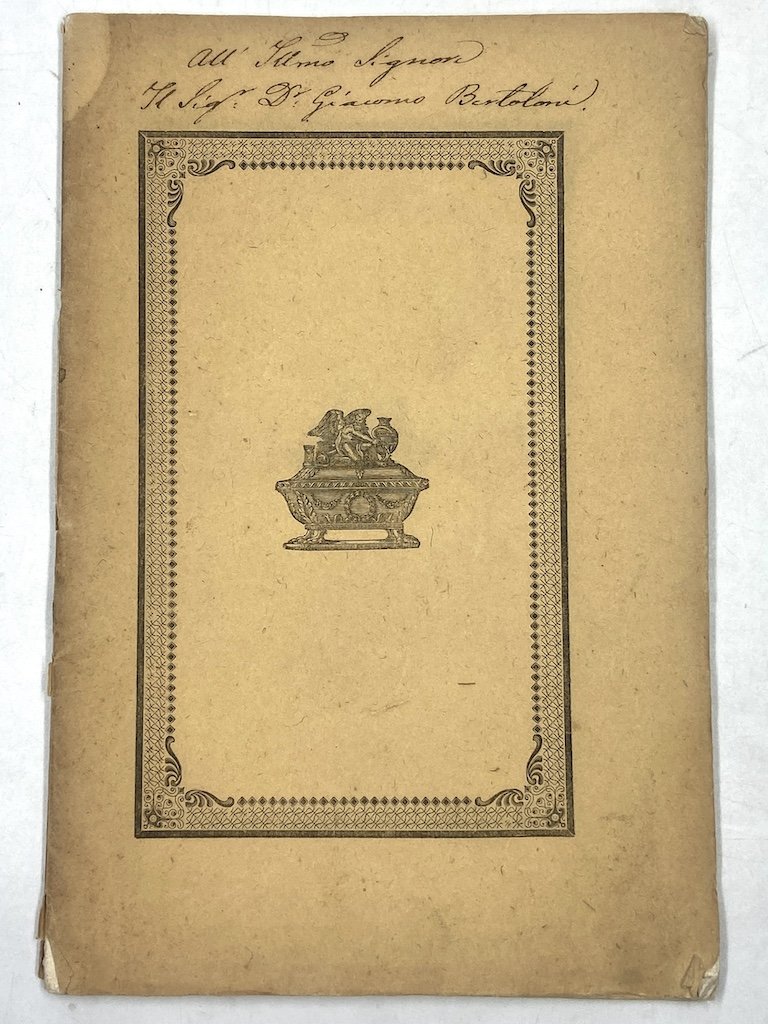 Opuscolo funebre, brossura editoriale con cornice e fregi (urne) sui piatti, dedica sul piatto anteriore, in ottavo cm 21x14, pp (48), testo riquadrato a lutto, piccole vignette sul frontespizio, prima e ultima carta. Ricordo funebre del numismatico bolognese Filippo Schiassi (1763-1844) in forma di lunga epigrafe di Michele Ferrucci (Lugo 1801 - Pisa 1881) suo allievo e amico, con cui collaborò al Lexicon Epigraphicum Morcellianum. Estratto dal Giornale Ecclesiastico Filosofico Letterario di Bologna Vol. IV Fasc. V, non risulta in questa forma autonoma presente in ICCU.