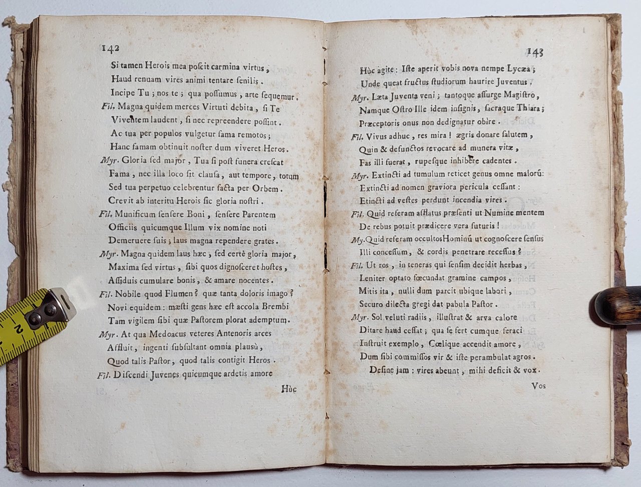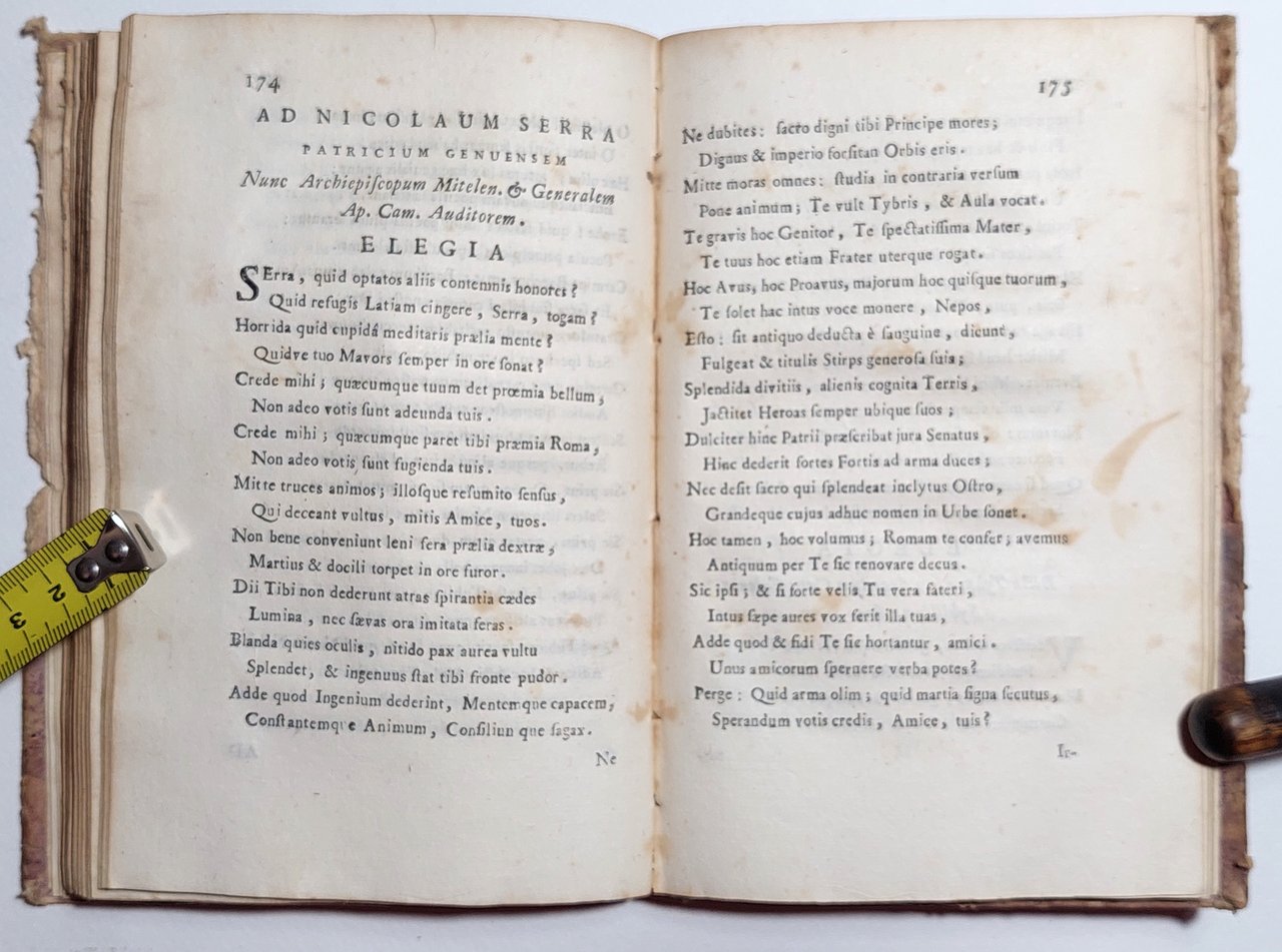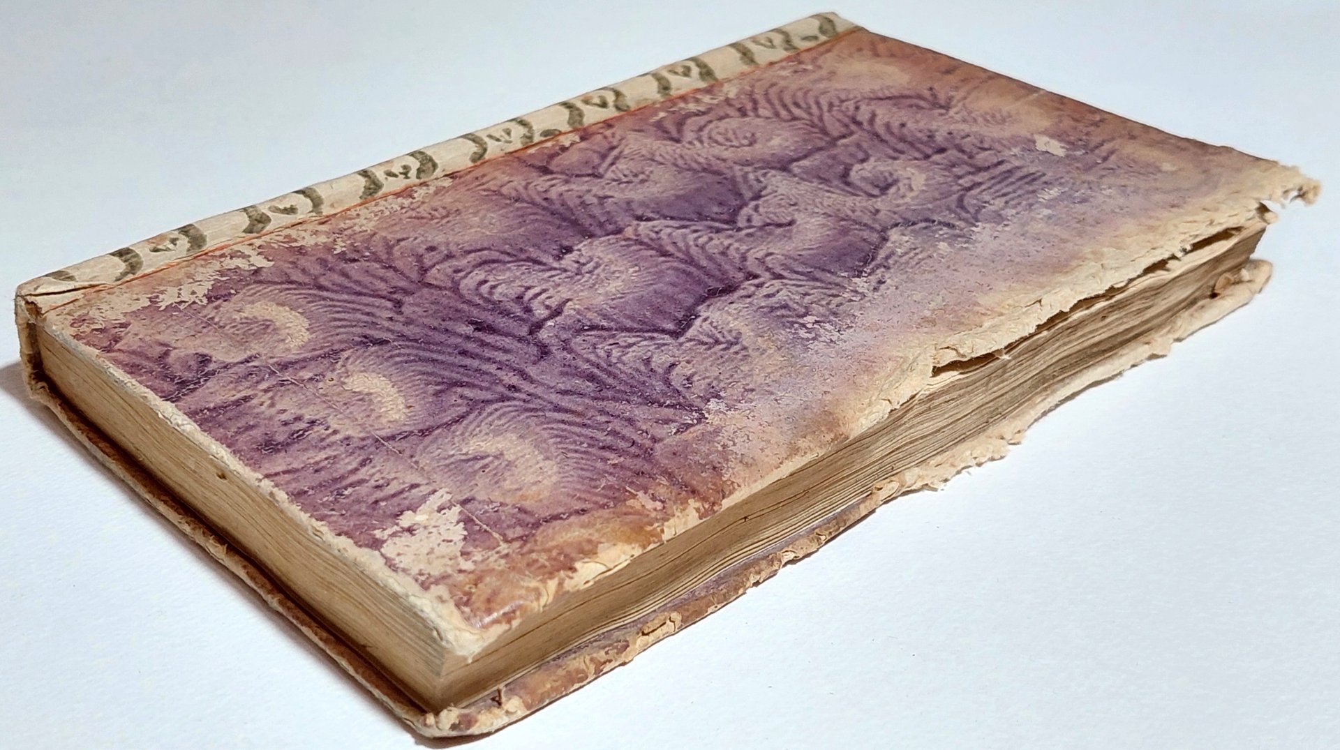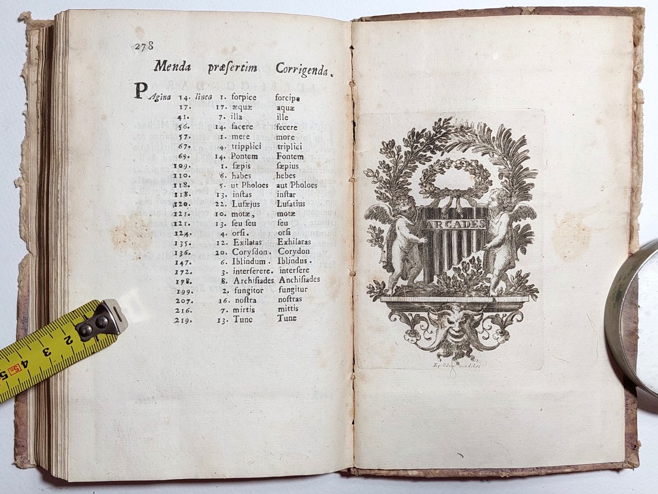 Legatura rigida cartonata con abrasioni e mancanze ai margini, tagli irregolari bruniti impolverati quelli superiori, piccoli strappi al margine esterno dell'antiporta, frontespizio con alcune lievi fioriture, testatine incise, rottura alla cerniera alla prima pagina bianca e al frontespizio, legatura a vista a pagina 1, brunitura al margine esterno delle pagine, alcune fioriture che non impediscono la lettura, in latino, numero pagine (8) +278, all'ultima pagina incisione dimensioni cm 19,2 * 12