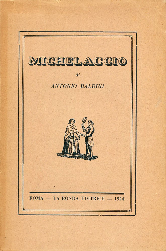 LIBROPrima edizione.Ottimo esemplare, normalmente brunito alle carte. Firma di possesso al frontespizio.Prima edizione in volume del racconto dallo stile picaresco «Michelaccio», già apparso a puntate nel 1920 su «L’Idea Nazionale» e qui accompagnato da «Novella di Gennarino Re» e «Novella di Duccio Cannabile», pubblicato dalla casa editrice «La Ronda» nel 1924 (ma finito di stampare il 20 luglio 1923). Scrittore, critico e giornalista, già collaboratore di «La Voce» dal 1912, Antonio Baldini fu tra i fondatori - subito dopo la fine della prima guerra mondiale cui prese parte facendo rivivere quell’esperienza nel libro del 1918 «Nostro purgatorio» - della rivista «La Ronda», di cui fu uno dei redattori - ovvero uno dei “sette savi”, come i membri della redazione amavano definirsi - più significativi. Fu in seguito anche collaboratore di «La Tribuna» e del «Corriere della sera», oltre che fondamentale compilatore della «Nuova Antologia». Ironico e capace di spaziare tra generi e stili diversi, Baldini fu un profondo conoscitore della letteratura e della poesia italiane, in particolare di Ariosto, Petrarca, Manzoni e Carducci, senza dimenticare l’amatissimo Leopardi.