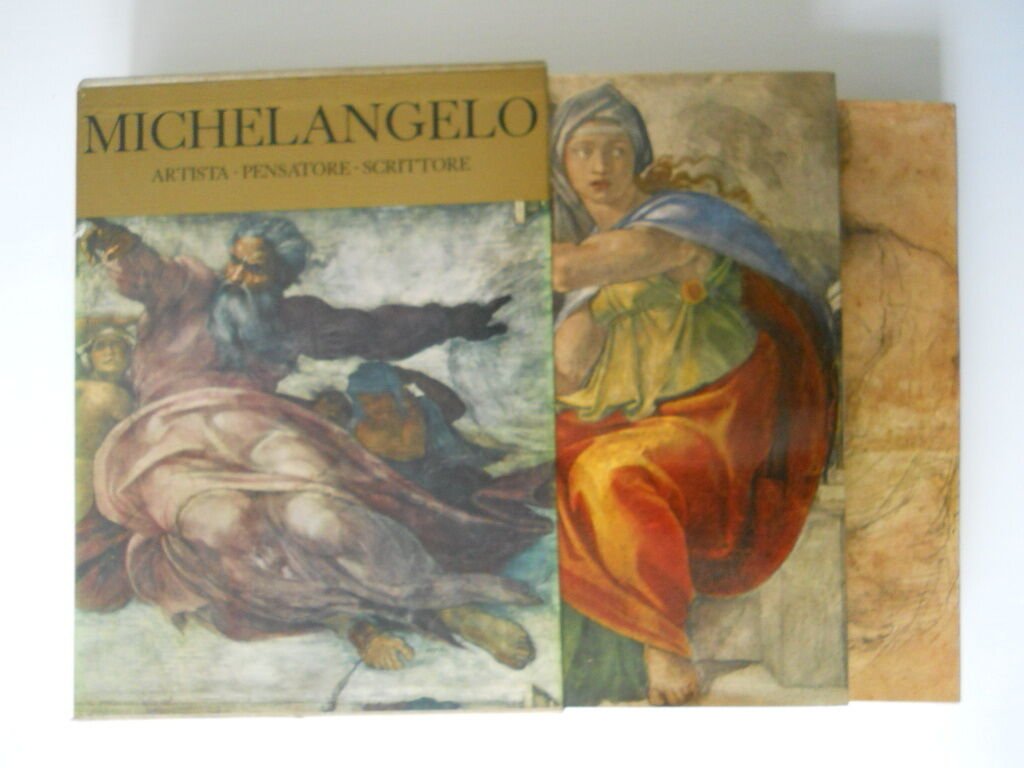 MICHELANGELO ARTISTA PENSATORE SCRITTORE DE AGOSTINI 1965In folio, 2 volumi, pag. 615, legatura editoriale, sovracoperta e custodia illustrate, illustrazioni a colori e b/n.