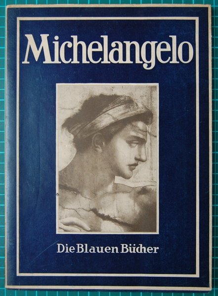Un volume, 26,5 x 19 cm; pp. 128; leg. ed. in cartone blu con cornici e riquadrature decorate ai piatti, titolo al piatto ant. e al dorso, sovracoperta blu con cornici bianche ai piatti, titolo al dorso e al piatto ant. a caratteri bianchi, illustrazione di colore bianco-seppia al piatto ant. (riproduzione di opera di Michelangelo); guardie blu-nere; taglio superiore di colore blu-nero; opera facente parte della collana "Die Blauen Bucher"; front. con titolo a caratteri neri entro cornice a numerosi filetti neri, secondo front. a seguire con busto di Michelangelo in cornice tonda, titolo (Michelangelo Buonarroti. 6 Marz 1475 - 18 Februar 1564), cornici rettangolari a molti filetti neri con decori e motto in alto (non vi si pensa quanto sangue costa); testo (16 pp.) e fotoriproduzioni in b/n delle opere del maestro. L’anno di pubblicazione non è indicato, ma dovrebbe essere il 1941. Rif.: OCLC, 66750474. Cond.: opera in buone condizioni generali.