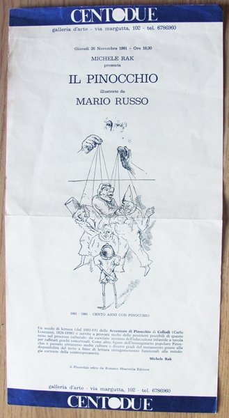 Locandina della mostra organizzata dalla galleria d'Arte Centodue di Via Margutta in Roma per la presentazione del Pinocchio di Michele Rak illustrato da Mario Russo in occasione del Centenario di Pinocchio. 25x48. Piega centrale. Ottimo stato. ,