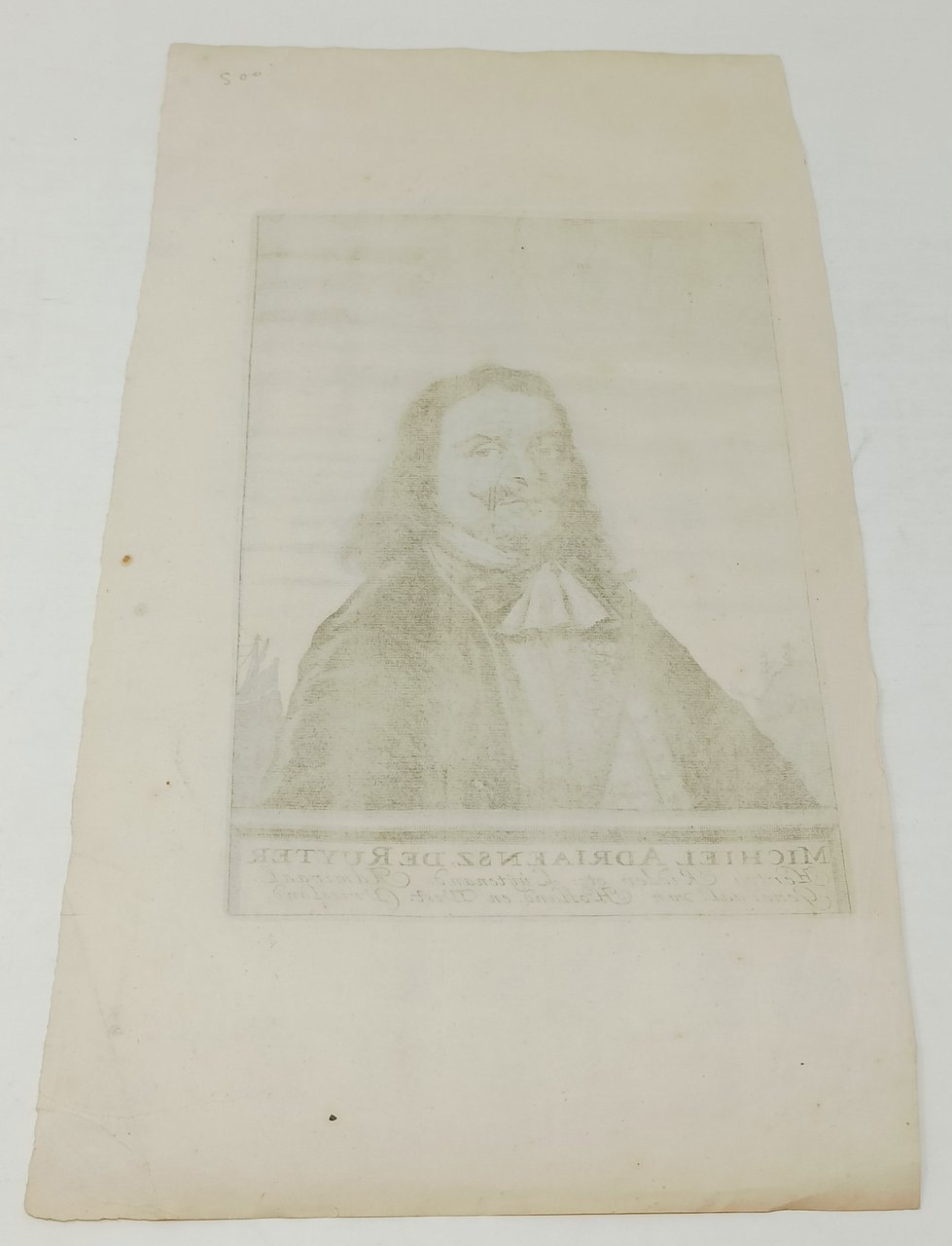 Incisione originale di grandi dimensioni (foglio: 22 x 39,5 battuta:16,5 x 24 cm circa) su carta a mano sottile. Ritratto dell'ammiraglio Michiel Adriaensz. de Ruyter (1607 - 1676). Stato di conservazione: stampa decisamente fresca con due o tre marginali macchioline (ingiallimenti) e qualche marginale piega. Bordi leggermente irregolari. Tenuto conto dell'età si tratta di un ottimo esemplare. Sicuramente rara. Non datata ma, presumibilmente, risalente al secolo XVII.