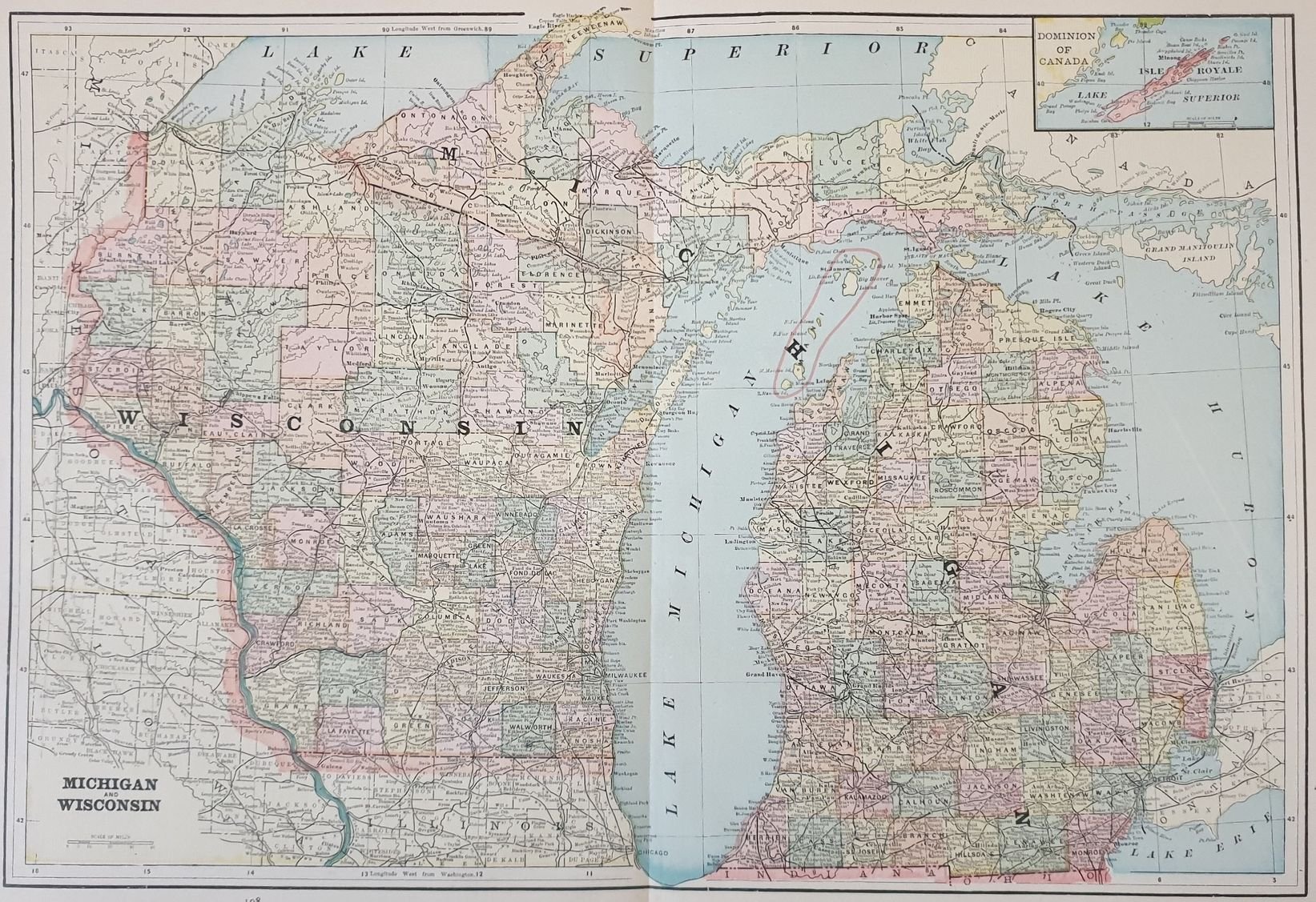 Bellissima mappa colorata a doppia pagina degli Stati del Michigan e Wisconsin, grandi dimensioni. Al verso mappa colorata della città di Milwaukee e Detroit. Autore: George F. Cram Atlante: Standard American atlas of the world Data: 1890 circa Tecnica: litografia Dimensione del foglio: 36,5x55,5 cm Dimensione dell'incisione: 47x32 cm Condizioni:Buone. Alcune gore di umidità marginali.Very beautiful double page coloured map of the States of Michigan and Wisconsin, big size. In the verso coloured map of Milwaukee and Detroit. Author: George F. Cram Atlas: Standard American atlas of the world Date: 1890 circa Technique: lythography Leaf Dimension: 36,5x55,5 cm Engraving Dimension: 47x32 cm Conditions: Good conditions. Some little water stains in the edges.