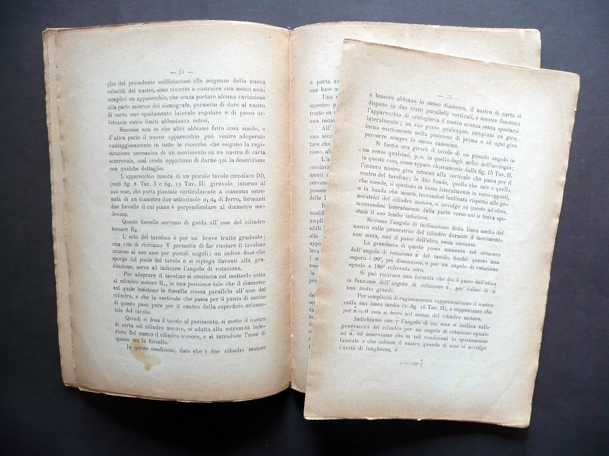 Giulio Pacher, † I Microsismografi dell'Istituto di Fisica della R. Universit‡ di Padova Tip. Ferrari, Venezia 1897; cm 22,5x15; pp. 62 pi˘ tre tavole in b/n ripiegate al termine del testo; mancanza del dorso e della brossura post. (vedi foto). Margine sup. della brossura ant. con dedica autografa firmata dell'autore. † Condizioni di conservazione Esemplare in condizioni pi˘ che discrete con tracce d'uso e alcune leggere bruniture; mancanza del dorso e della brossura post., il primo oggetto di restauro mediante l'applicazione di carta giapponese; esemplare compatto. Tracce di vecchie etichette applicate; margini con normali lievi accenni d'ingiallimento del tempo. Pp. 33-44 staccate dal corpo del testo (vedi foto). † Con tre tavole in bianco e nero ripiegate al termine del testo. Margine superiore del frontespizio con dedica autografa firmata dell'autore. † OPEB.3577 N