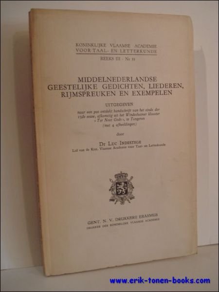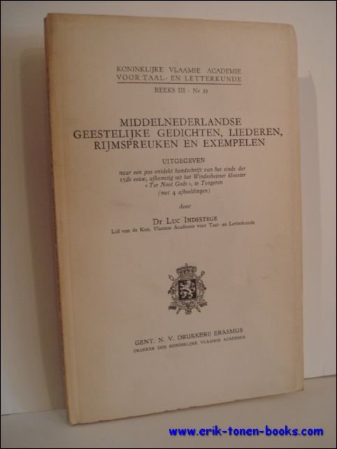 Originele uitgeversomslag, papieromslag, 140 x 225mm., 111pp. Uitgegeven naar een pas ontdekt handschrift van het einde der 15de eeuw, afkomstig uit het Windesheimer klooster " Ter Noot Gods ", te Tongeren. Koninklijke Vlaamse Academie voor Taal- en Letterkunde Reeks III - Nr. 33. In goede staat.