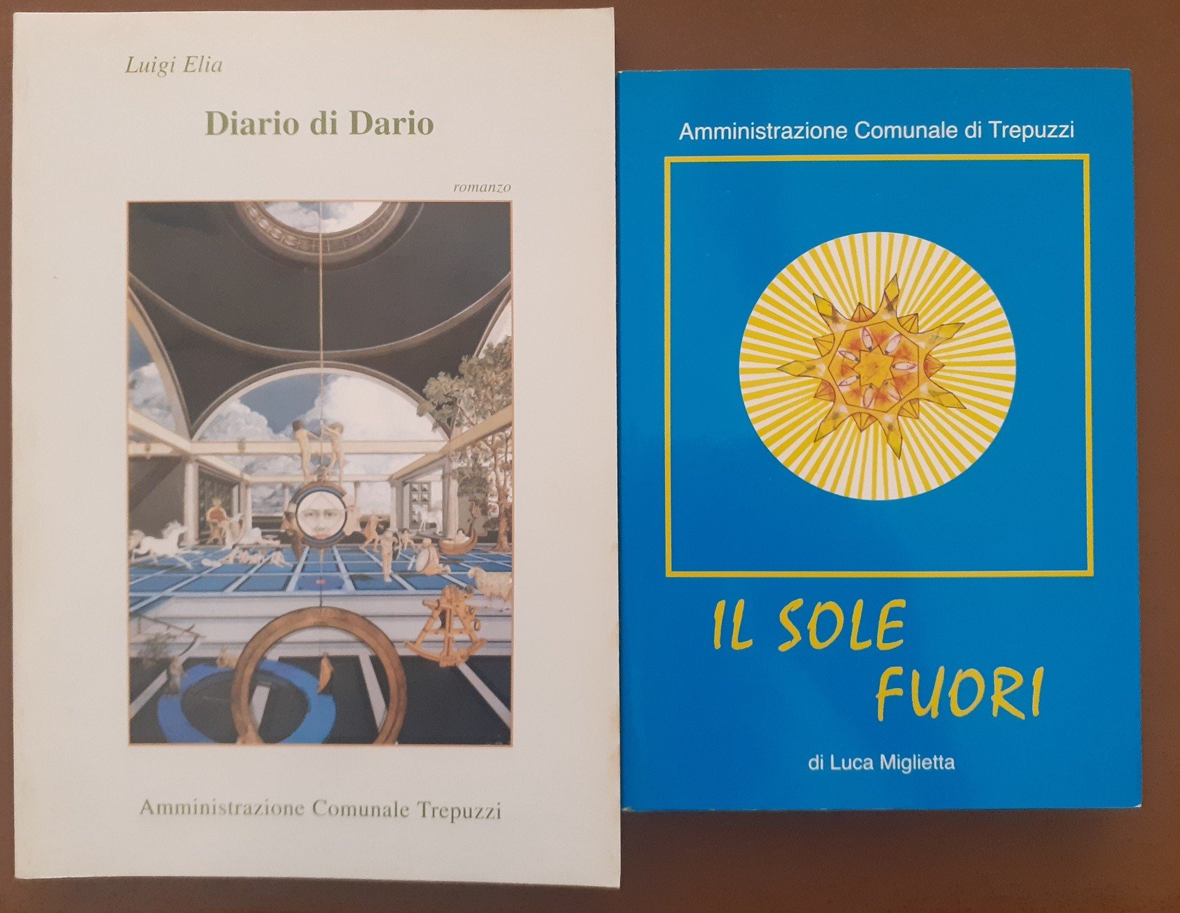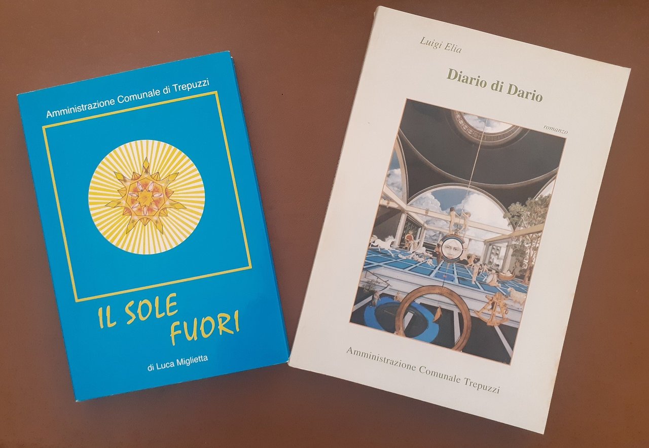 Luca Miglietta, Il sole fuori, s.n., s.l. (ma stampato a Trepuzzi, presso lo Stabilimento Tipografico Publigrafic s.n.c.) 1999, pp. 188, cm 19, br. ed. con alette. (In testa al frontespizio: Amministrazione comunale di Trepuzzi. Collana Arte, cultura e tradizioni popolari nel territorio di Trepuzzi, vol. 7). In lotto con: Luigi Elia, Diario di Dario. Romanzo, Amministrazione comunale di Trepuzzi, s.l. (ma stampato a Lecce, presso la Cartografia Rosato) 2000, pp. 219, cm 23, br. ed. (Collana Arte, cultura e tradizioni popolari nel territorio di Trepuzzi, vol. 8. Al dorso: Centro Studi Salento). Il lotto comprende i volumi 7 e 8 della collana Arte, cultura e tradizioni popolari nel territorio di Trepuzzi. Minimi segni del tempo a brossura e tagli, per il resto ottimi esemplari.