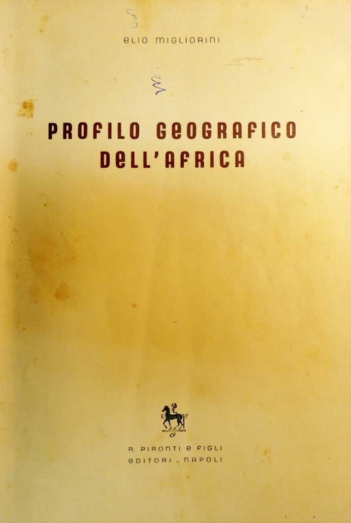 Elio Migliorini, Profilo geografico dell’Africa, R. Pironti e Figli Editori, Napoli 1955, pp. 121, ill. b.n., cm 25, br. ed. Analisi fisica, antropica ed economica del continente africano. Firma d’appartenenza all’occhiello. Tracce d’uso, ma ancora buona copia.