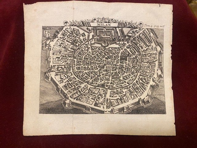 Incisione originale raffigurante la piantina della città di Milano tratta da: Les delices de l'Italie contenant une description exacte du Pais…Paris, par la Compagnie des Libraires, 1707. L'incisione misura 17,5 x 15,5 il foglio e 14,6 x 10,3 più cornice, la mappa. Buone le condizioni e l'inchiostratura.