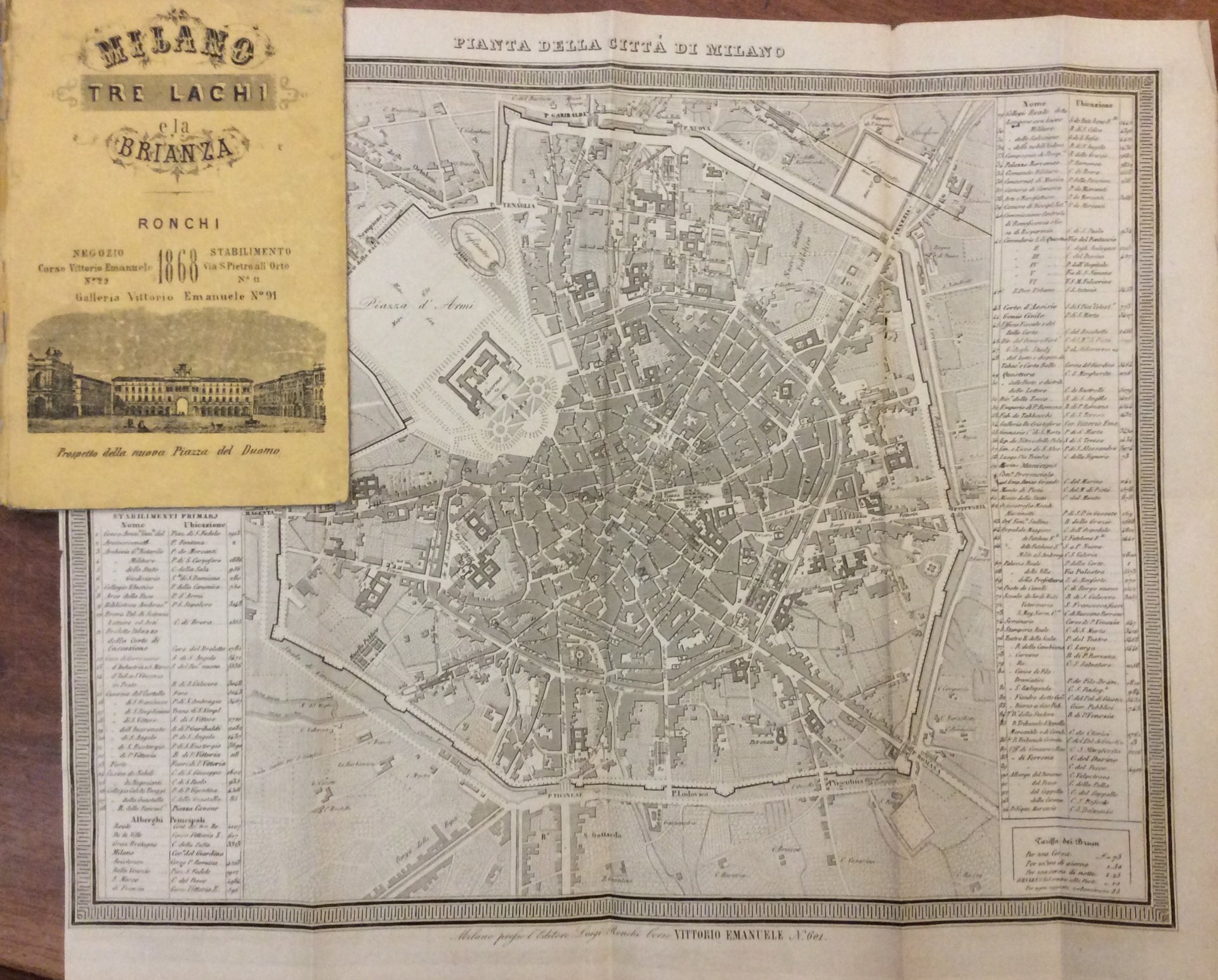 In-16 (mm. 175x112), cartonato editoriale (picc. manc. al dorso), pp. 220, bel frontespizio con una incisione raffigurante il Palazzo della Ragione, alcune incisioni nel testo (anche a piena pagina), una grande pianta topografica della città (mm. 340x400), una carta di Milano e i 3 laghi e 5 tavole fuori testo. Contiene, con proprio frontespizio, da p. 116 a 220: "Viaggio ai laghi Maggiore, di Lugano, di Como, d'Orta, al Varesotto, Magenta e Brianza" per cura di Massimo Fabi. E' quasi una ristampa dell'edizione del 1859 con qualche cambiamento per le notizie al viaggiatore (Alberghi, Restaurants, Caffè, Banche, Omnibus, Teatri, Negozianti ecc.). E' interessante rilevare che a seguito dei cambiamenti dei numericivici dall'inizio del 1866, per alcuni indirizzi vi è già la nuova numerazione mentre per altri vi è ancora la vecchia. Ad esempio, per l'editore L. Ronchi al frontespizio è indicato Corso Vittorio Emanuele n. 602, mentre in copertina appare Corso Vittorio Emanuele n. 22. (Cfr. L. Villa, Bibliografia delle Guide di Milano, scheda n. 272). Esemplare ben conservato.