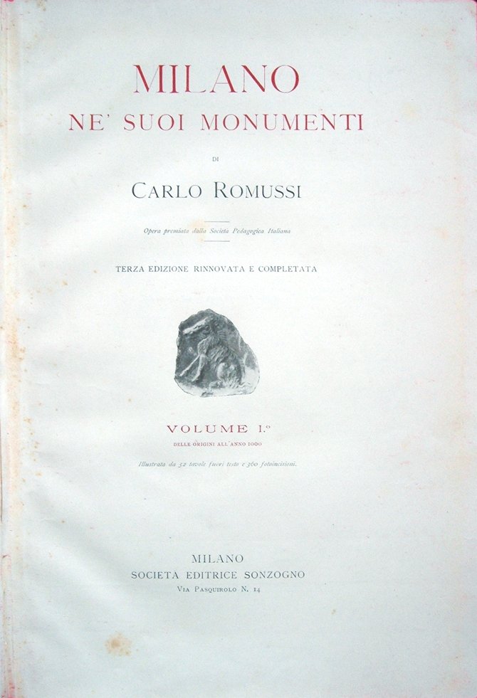 Due volumi in-4° (29,5x19 cm), pp. (4), 423, (1); (4), 443, (1), 5, (3), legatura coeva in mezza pelle con punte in pergamena. Qualche traccia d'uso al dorso, in particolare leggere abrasioni e spellature.Tagli rossi. Conservata la copertina editoriale anteriore, a colori, di entrambi i volumi. Con 52 tavole fuori testo, di cui 5 a colori, e 360 illustrazioni al Volume primo e 53 tavole fuori testo, di cui 6 a colori, e 356 illustrazioni al Volume secondo. Al volume secondo, per un errore del legatore le pagine di indice 441-443 si trovano subito dopo il foglio con il frontespizio, in questo ordine: pagina 443 - pagina bianca non numerata (il verso del foglio con al recto p. 443) - pagina 441 - pagina 442: il resto dell'indice si trova regolarmente in fondo al volume. Dopo le pagine di indice in fine, è stato rilegato un necrologio di Carlo Romussi, di pagine 5, (3), con un ritratto fotografico in bianco e nero dello studioso. Alla carta fuori testo, più volte ripiegata, intitolata "Topografia di Milano assediata dall'Imperatore Federigo Primo nell'anno MCLVIII", restauro lungo una piegatura ben eseguito con carta goapponese. Strappetto, lontano dal testo, ben rimarginato, sempre con l'utilizzo di carta giapponese, nel margine inferiore del foglio con le pagine 103-104 e nel margine superiore delle pagine dalla 137 alla 144. Ad entembi i volumi, poche, leggere fioriture alle primissime pagine e qualche lieve segno d'umido, per il resto, ben conservato. Opera di grande interesse, ricchissima di circostanziate notizie storiche e corredata di un vasto ed accurato apparato iconografico, composto da centinaia di illustrazioni, nella gran parte fotografiche, raffiguranti sculture, bassorilievi, monete, armi, chiese, palazzi, lapidi, monumenti funebri, dipinti. Premiata dalla Società Pedagogica Italiana. Indice: Volume primo. Le trasformazioni di Milano; Milano preistorica; Milano storica; Milano romana; I primi monumenti cristiani; Invasioni e oppressioni barbariche; Gli arcivescovi. Volume secondo. Il Comune dalle origini alla signoria; La signoria viscontea; Il Duomo. Nota di spedizione: il peso complessivo dei volumi supera i 4 chilogrammi (kg 4,6 al netto dell'imballo).