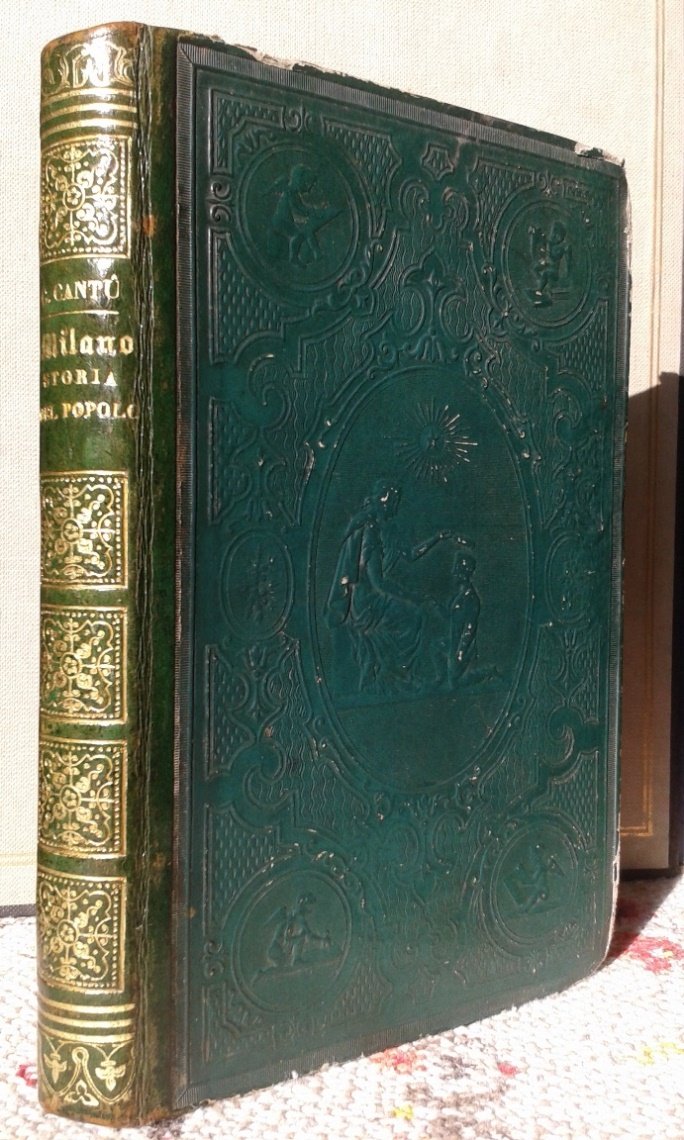 Volume in 8, legatura coeva in piena pelle, impressa a secco ai piatti con scene allegoriche e disegni ornamentali, titolo al dorso riccamente decorato in oro ai piccoli ferri, tagli spruzzati, sguardie, occhiello, frontespizio, indice ed introduzione, VIII, 344 pp. Vivido, interessante schizzo storico sul territorio milanese e non solo. L'opera raccoglie, per la prima volta in volume e con miglioramenti ed aggiunte, lo scritto storico che fungeva da introduzione alla celebre 'Milano e suo territorio' del 1844. Curioso e di piacevole lettura. Ottimo fresco esemplare, rarissime fioriture.