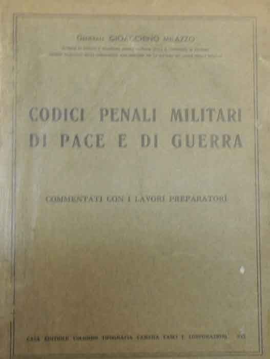 Gioacchino Milazzo, Codici penali militari di pace e di guerra commentati con i lavori preparatori, Casa editrice Colombo Tipografia Camera fasci e corporazioni, s.l. 1941, pp. VIII, 175, br. ed. Firma dell'autore. Timbro d'appartenenza alla prima e all'ultima pagina, tracce d'uso alla brossura, ma interno in buono stato di conservazione.