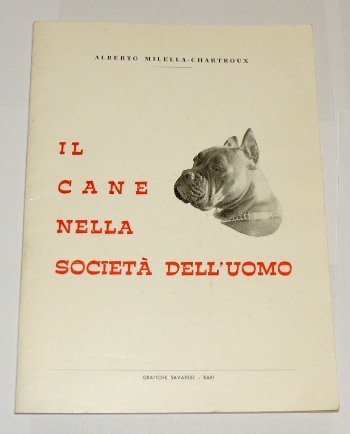 Alberto Milella-Chartoux, Il cane nella società dell'uomo, Grafiche Savarese, Bari s.d. (1966?), pp. 25, cm 22. Paragrafi: Principi per lo studio della psicologia animale, Animali ed ambiente esterno. Il cane e l'uomo, Il cane nella storia, Senso psicologico nella figurazione del cane, Necessità del cane come simbolo, Amate il cane.