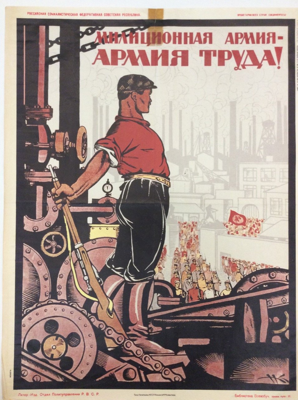 Poster a colori (cm. 64,5x50), allegato al n. 45 di Vie Nuove del 9-11-1967. Riproduzione di un poster di propaganda russa eseguito dall'artista russo Nikolai Mikhailovich Kochergin (1897-1974), intorno al 1920, per celebrare la Rivoluzione del 1917, dal titolo: Esercito di milizia - Esercito di lavoro!. Vi è raffigurato un operaio armato di fucile che si erge orgogliosamente davanti ad una macchina industriale, sotto di lui operai che sfilano in gruppo mentre tengono in spalla un fucile. Al margine superiore bianco: Rosskaskaja Socialisti eskaja Federativnaja Sovetskaja Respublika (P C C P ) - Proletarii Vsech Strai Soedinjaitesy ( ) (Repubblica Sovietica Federativa Socialista Russa / Proletari di tutto il mondo unitevi). Traccia di nastro adesivo al margine superiore, altrimenti ben conservato.