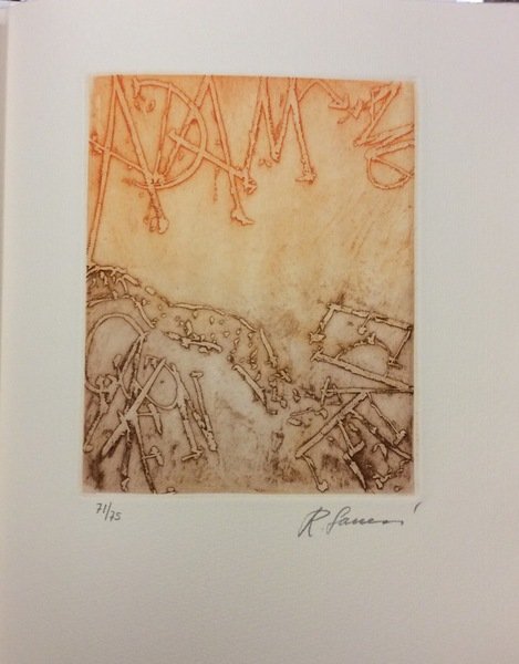 In-4 gr. (mm. 350x210), custodia, legatura edit. in cartoncino con impresso il titolo su fondo criblé scuro e contenente, a fogli sciolti, 16 cc.nn. Questo libro, dedicato al Paradise Lost di John Milton è stato ideato da Giorgio Upiglio e raccoglie 5 incisioni a colori eseguite dal poeta e storico dell'arte Roberto Sanesi nel 1988, stampate con il torchio dall'editore, numerate e firmate dall'Autore. I testi sono stati composti in Times ed impressi su carta Magnani di Pescia.Edizione di 85 copie numerate. La ns., 71, è molto ben conservata.