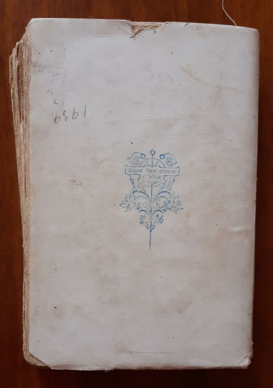 Copertina: cartonata, sporca, ingiallita. Margini delle pagine: ingialliti. Pagine testo: ingiallite, brunite ai margini. Legatura: artigianale. Frontespizio: con dedica, ingiallito. Sguardi: ingialliti. Taglio: con fioriture, ingiallito, irregolare in modo lieve, sporco, in cartoncino millerighe. Dorso: scolorito, usurato Buono (Good) .