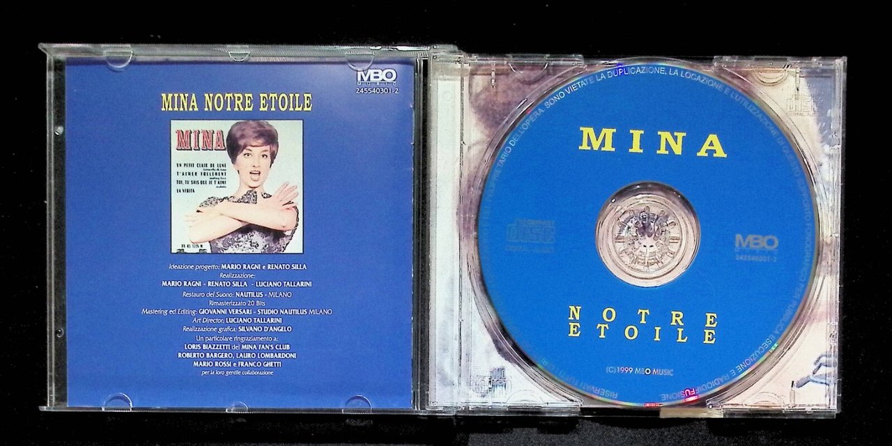 Artista: Mina Etichetta: MBO Music Genere: Pop Anno di pubblicazione:1999 Mina (3) – Notre Etoile Etichetta: MBO Music - 245540301-2 Formato: CD , Compilation, Remastered Paese: Italy Uscita: 1999 Genere: Pop Stile: Vocal,Schlager Elenco tracce: 1 Mina (3) – Notre Etoile = Heisser Sand 2:59 2 Mina (3) – T'Aimer Follement = Making Love 1:58 3 Mina (3) – Toi Tu Sais Que Je T'Aime = Malatia 2:47 4 Mina (3) – Renato 2:08 5 Mina (3) – Pleurer Pour Toi = Just Let Me Cry 2:20 6 Mina (3) – Doucement = Slowly 2:07 7 Mina (3) – Les Confettis = Coriandoli 3:09 8 Mina (3) – Tout S'Arrange Quand On S'Aime = Stessa Spiaggia Stesso Mare 2:07 9 Mina (3) – Folle Girouette = Folle Banderuola 2:18 10 Mina (3) – L'Eclipse Twist = Eclisse Twist 2:53 11 Mina (3) – Un Petit Claire De Lune = Tintarella Di Luna 3:15 12 Bob Mitchell (3) – Plus Fort Que Nous (Strumentale) 2:53
