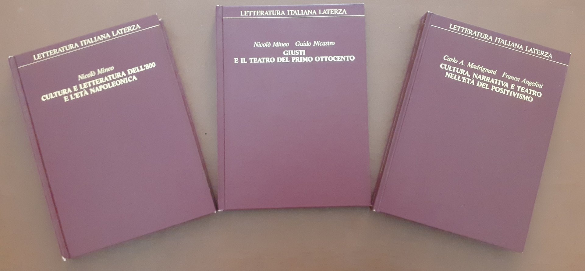 Nicolò Mineo, Cultura e letteratura dell’’800 e l’età napoleonica, Editori Laterza (Gius. Laterza e Figli Spa), Roma-Bari 1985, quarta rist., pp. 179, cm 22, legatura in similpelle ed. con titoli in oro al dorso e al piatto (collana Letteratura italiana Laterza, vol. 39. Serie Il primo Ottocento. L’età napoleonica e il Risorgimento, 1-12). In lotto con: Nicolò Mineo, Guido Nicastro, Giusti e il teatro del primo Ottocento, Editori Laterza (Gius. Laterza e Figli Spa), Roma-Bari 1985, quarta rist., pp. 91, cm 22, legatura in similpelle ed. con titoli in oro al dorso e al piatto (collana Letteratura italiana Laterza, vol. 44. Serie Il primo Ottocento. L’età napoleonica e il Risorgimento, 64-72). In lotto con: Carlo A. Madrignani, Franca Angelini, Cultura, narrativa e teatro nell’età del Positivismo, Editori Laterza (Gius. Laterza e Figli Spa), Roma-Bari 1985, quarta rist., pp. 201, cm 22, legatura in similpelle ed. con titoli in oro al dorso e al piatto (collana Letteratura italiana Laterza, vol. 52. Serie Il secondo Ottocento. Lo Stato unitario e l’età del Positivismo, 51-72). Il lotto comprende i tre volumi Cultura e letteratura dell’’800 e l’età napoleonica, di Nicolò Mineo, Giusti e il teatro del primo Ottocento, di Nicolò Mineo e Guido Nicastro e Cultura, narrativa e teatro nell’età del Positivismo, di Carlo A. Madrignani e Franca Angelini, tutti e tre Editori Laterza, collana Letteratura italiana Laterza, voll. 39, 44 e 52. Minime tracce d’uso alle legature, per il resto ottimi esemplari.
