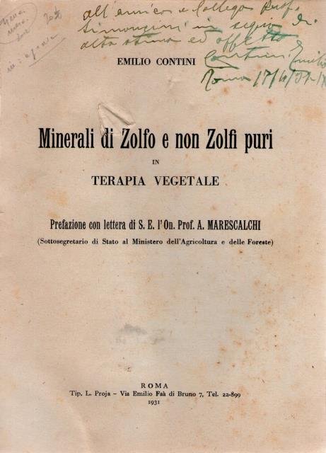 Prefazione con lettera di S. E. l'On. Prof. Marescalchi (Sottosegretario di Stato al Ministero dell'Agricoltura e delle Foreste). Tipografia L. Proja, Roma, 1931. In 8vo, pp. 159 con Errata corrige e Indice, con 2 riprod. fot. in b/n n. t. , bross. edit. con titoli in nero. Firma di appartenenza privata al piatto e dedica manoscritta dell'Autore alla stessa firma. Un piccolo buco ha leso la carta della brossura e le prime sei carte ma il tutto resta leggibile, mancanze della carta al dorso e allentamento generale, peraltro buono tutto l'interno.