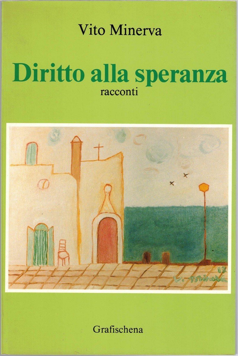 Vito Minerva, Diritto alla speranza. Racconti, Grafischena, Fasano 1988, pp. 94, cm 21, br. ed. con alette. Prefazione di Giovanni Procacci. In appendice: Mario Minerva, Un racconto – Nella Minerva, Racconti-flashes. Dedica manoscritta (dall’autore?) alla prima carta di guardia. Minime fioriture ai tagli, lievissima brunitura della carta, per il resto perfetto.