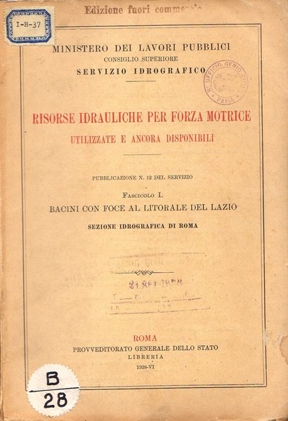 Ministero dei Lavori Pubblici. Consiglio Superiore. Servizio Idrografico. Risorse idrauliche per forza motrice utilizzate ed ancora disponibili. Pubblicazione n. 12 del Servizio. Fascicolo I. Bacini con foce al litorale del Lazio. Sezione idrografica di Roma.