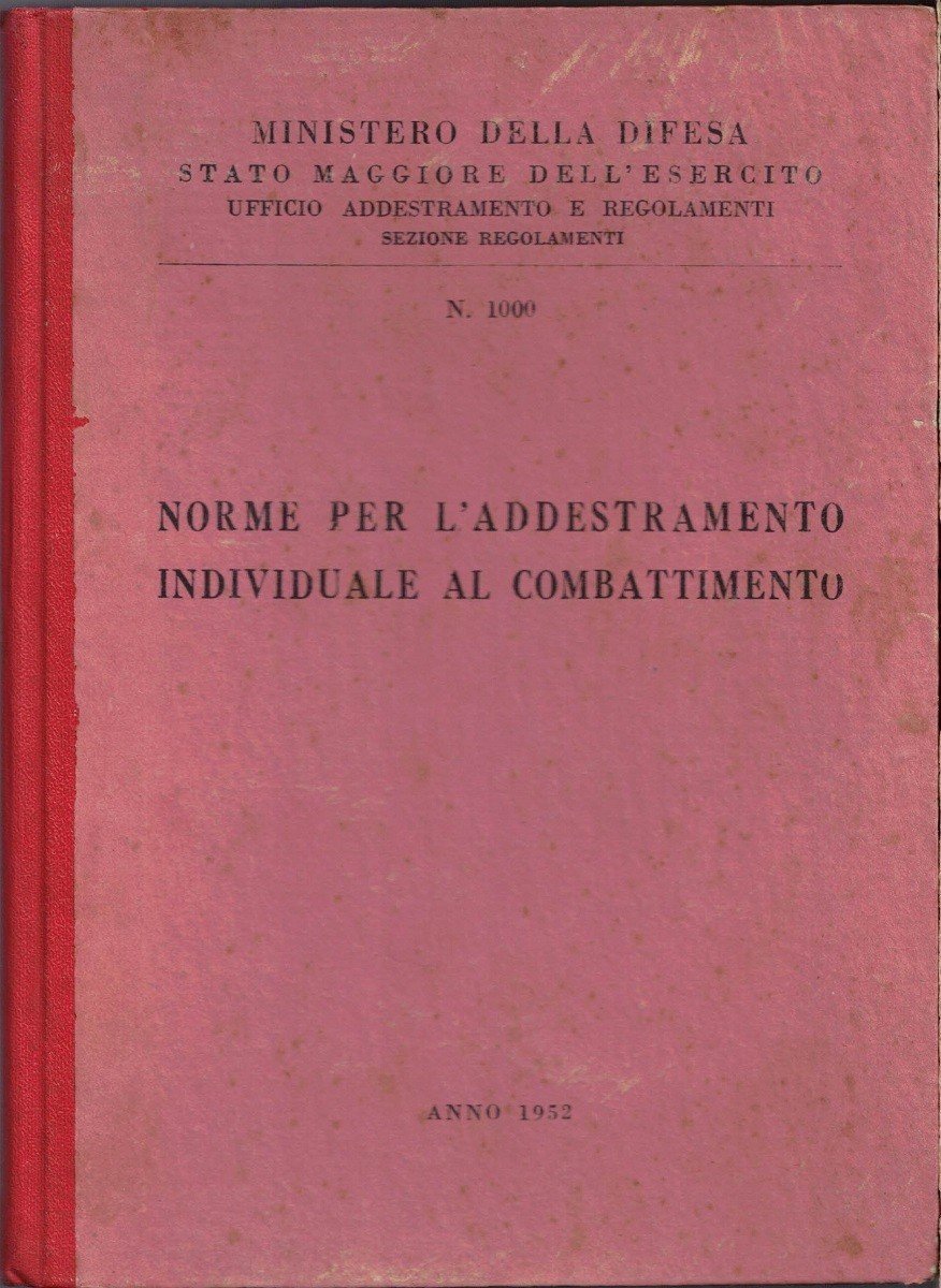 Ministero della Difesa – Stato Maggiore dell’Esercito – Ufficio addestramento e regolamenti – Sezione regolamenti, Norme per l’addestramento individuale al combattimento, s.n., s.l. 1952, pp. 198, cm 22, cart. ed. In apposita tasca al verso del piatto posteriore, allegato volume dal titolo: Ministero della Difesa – Stato Maggiore dell’Esercito – Ufficio addestramento e regolamenti – Sezione regolamenti, Norme per l’addestramento individuale al combattimento. Figure, s.n., s.l. 1952, pp. 328, interamente ill. b.n., cm 22, br. ed. Al frontespizio: n. 1000. Pubblicazione composta da due volumi, uno di teoria, l’altro interamente illustrato. Leggere tracce d’uso, una piccola mancanza a margine di prima carta di guardia e del frontespizio del volume di teoria, ordinari segni del tempo, per il resto esemplare ben conservato. Perfetto il volume di illustrazioni.