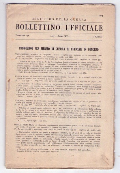 MINISTERO DELLA GUERRA. Bollettino ufficiale. Dispensa 25. 1937 6 Maggio. Promozioni per merito di Guerra di Ufficiali in Congedo.