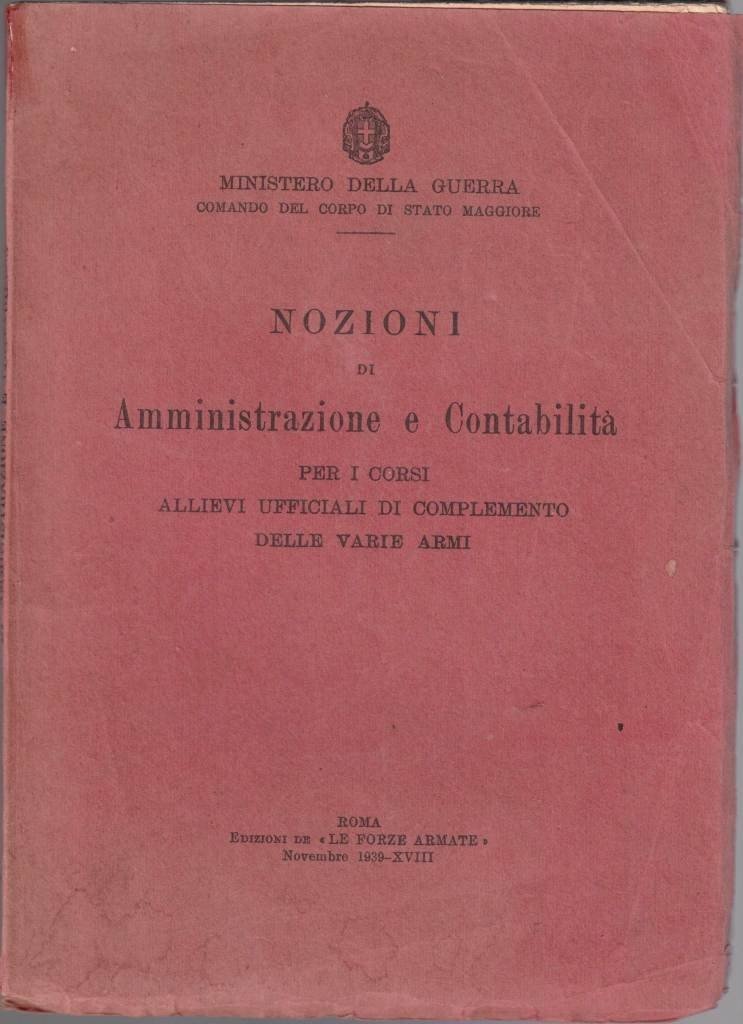 Ministero della Guerra – Comando del Corpo di Stato Maggiore, Nozioni di amministrazione e contabilità per i corsi Allievi Ufficiali di Complemento delle varie Armi, Edizioni de Le Forze Armate, Roma 1939 XVIII, pp. 120, cm 22, br. ed. Firma d’appartenenza a margine del frontespizio. Leggere tracce d’uso, qualche sporadica sottolineatura e annotazione a lapis, per il resto minime fioriture, lieve brunitura della carta, ma nel complesso più che buona copia.
