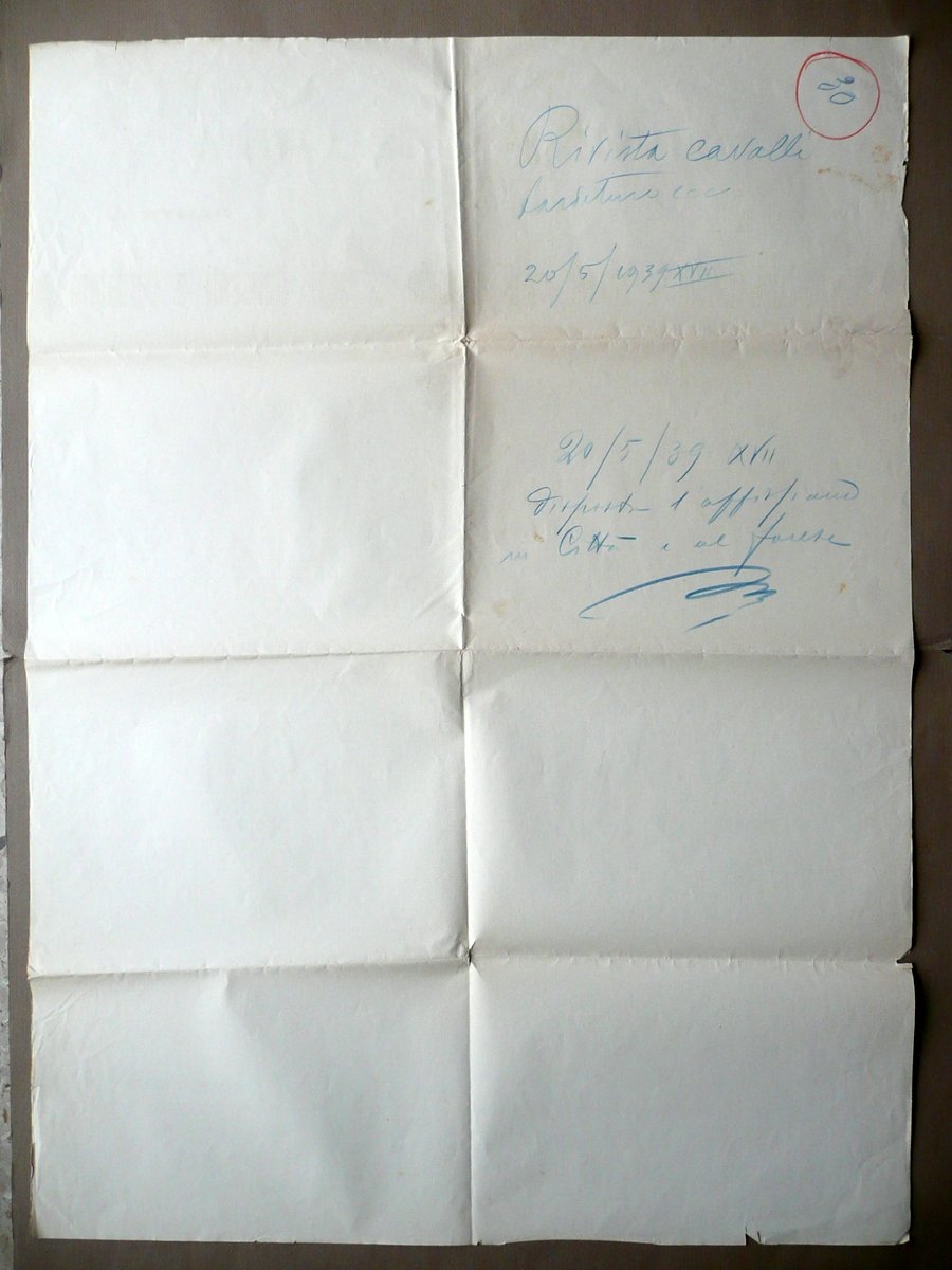 Disposizioni, Ministero della Guerra Provincia di Modena Rivista dei cavalli e cavalle, muli e mule, carreggi, finimenti e bardature Corpo d'Armata di Bologna Senza dati tip., s. d. (ma 1939); disposizioni a stampa su carta; sezioni bianche compilate con timbro; testo su due colonne. Cm 88,5x64. Retro con alcune annotazioni a pastello colorato (blu e rosso). Condizioni di conservazione: Esemplare ben conservato con tracce d'uso, normali pieghe di conservazione, margini e angoli con qualche piccolo strappetto e pieghetta; un paio di incroci delle pieghe con un minimo strappetto, i quali non impediscono la lettura del testo. SC03.D11738 N