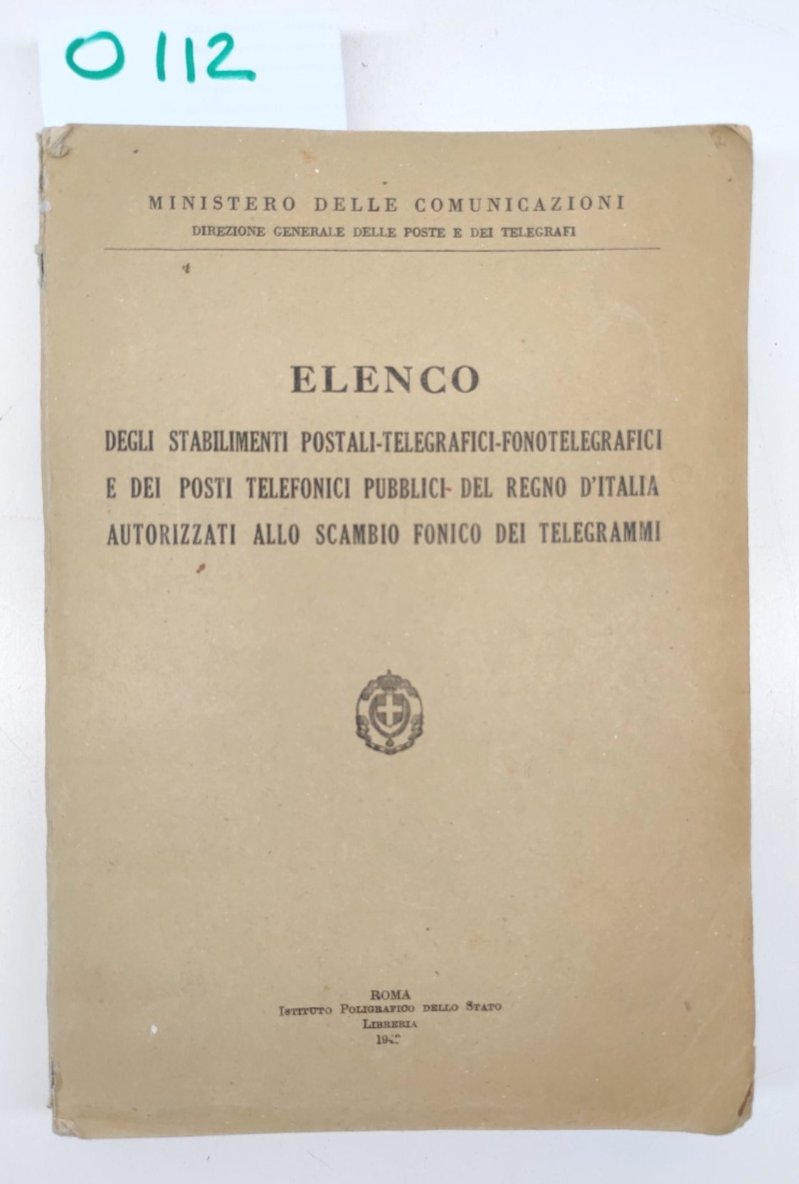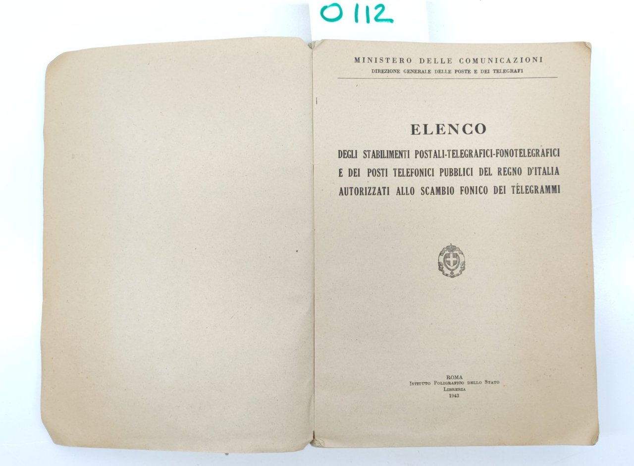 Ministero delle comunicazioni elenco degli stabilimenti postali telegrafici fono telegrafici e dei posti telefonici pubblici del Regno d'Italia autorizzati allo scambio fonico dei telegrammi Istituto poligrafico dello stato 1942