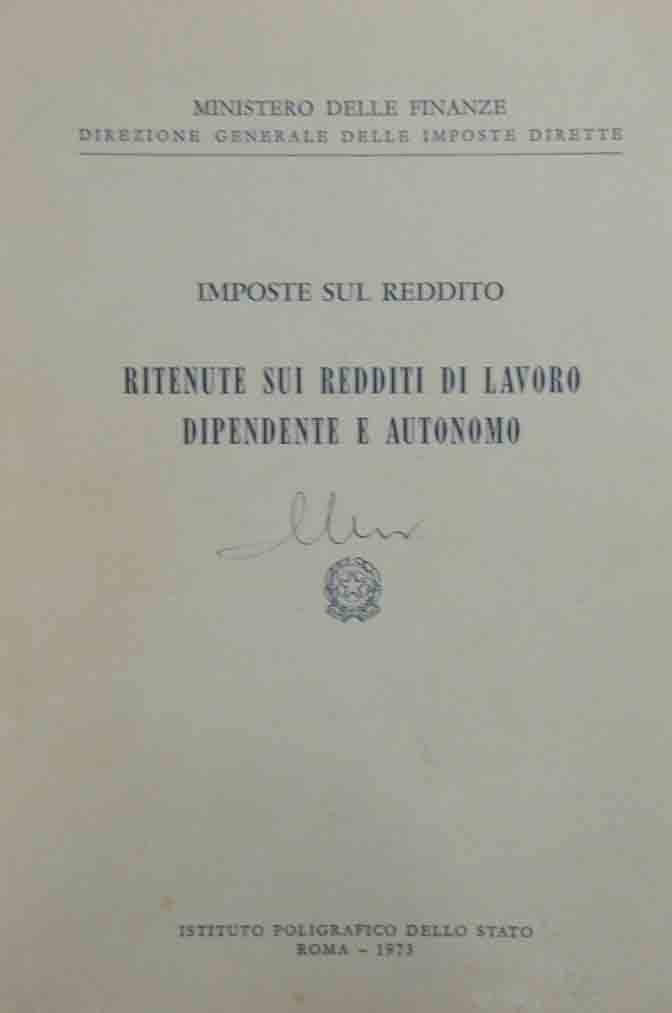 Ministero delle Finanze – Direzione Generale delle Imposte Dirette, Imposte sul reddito. Ritenute sui redditi di lavoro dipendente e autonomo, Istituto Poligrafico dello Stato, Roma 1973, pp. 104, cm 24, br. ed. Sigla di appartenenza alla prima di copertina e ad una carta interna. Tracce d’uso, alcune sottolineature e annotazioni a lapis, minima ingiallitura della carta, ma nel complesso copia in condizioni ancora accettabili.