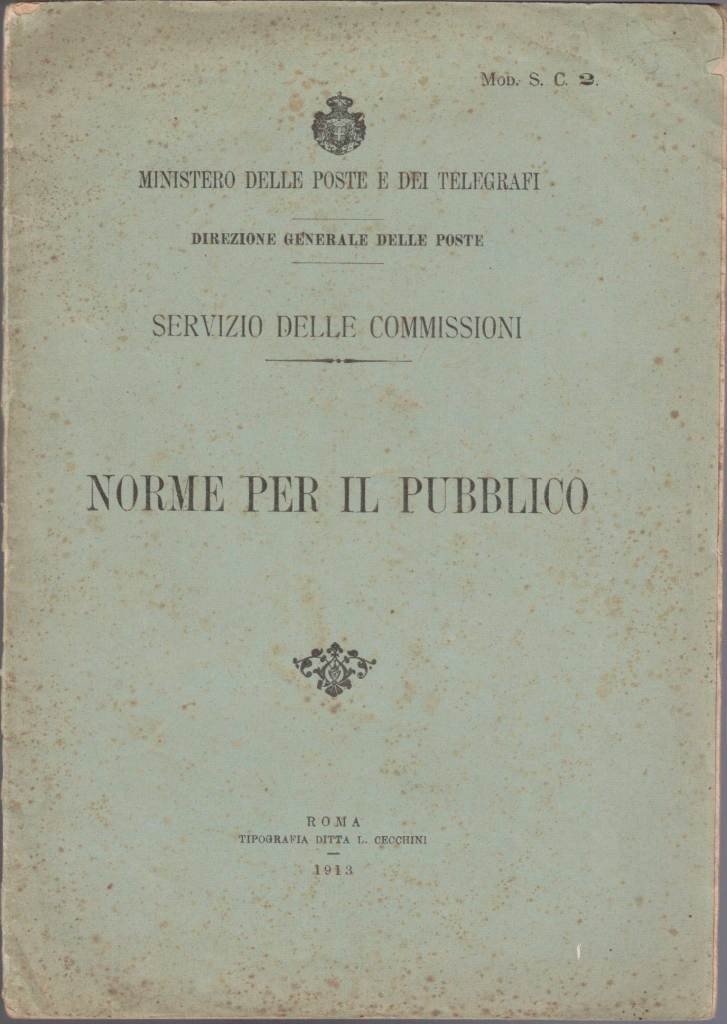 Ministero delle Poste e dei Telegrafi – Direzione Generale delle Poste, Servizio delle commissioni. Norme per il pubblico, Tipografia Ditta L. Cecchini, Roma 1913, pp. 63, cm 24, br. ed. In testa al frontespizio: Mod. S. C. 2. Copertina posteriore mancante, per il resto leggere tracce d’uso, minime fioriture, lieve brunitura della carta, ma nel complesso ben conservato. Raro.