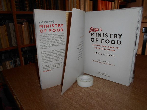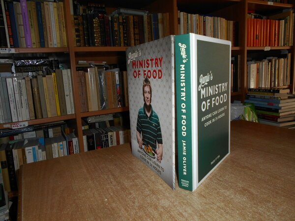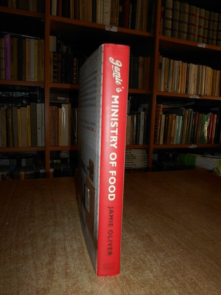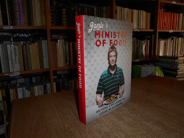 JAMIE'S. London, Michael Joseph, of Penguin Books, 2008. MINISTRY OF FOOD Anyone can learn to cook in 24 hours. In-8° grande, cartonato edit. con sovracopertina ill. a col. 360 pp. con numerose illustrazioni a colori anche a piena e doppia pagina con ricette e testo in inglese. In ottimo stato di conservazione. Uff. stanzetta mob. a sinistra II - 3 carc.