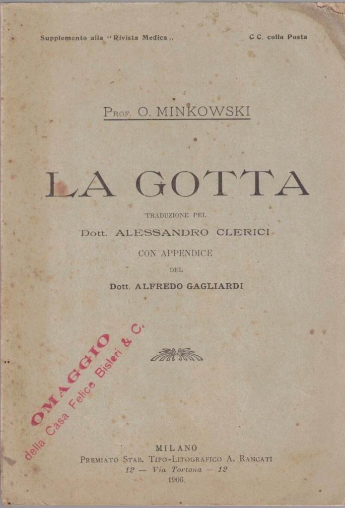 Prof. O. Minkowski, La gotta, traduzione pel Dott. Alessandro Clerici. Con Appendice del Dott. Alfredo Gagliardi, Premiato Stab. Tipo-Litografico A. Rancati, Milano 1906, pp. 142, cm 17, br. ed. In testa alla prima di copertina: Supplemento alla Rivista Medica. Alla prima di copertina, timbro: Omaggio della Casa Felice Bisleri e C. Leggere tracce d’uso alla brossura, piccolissima mancanza al dorso e al margine della prima di copertina, minime fioriture, lieve brunitura della carta, per il resto bell’esemplare.