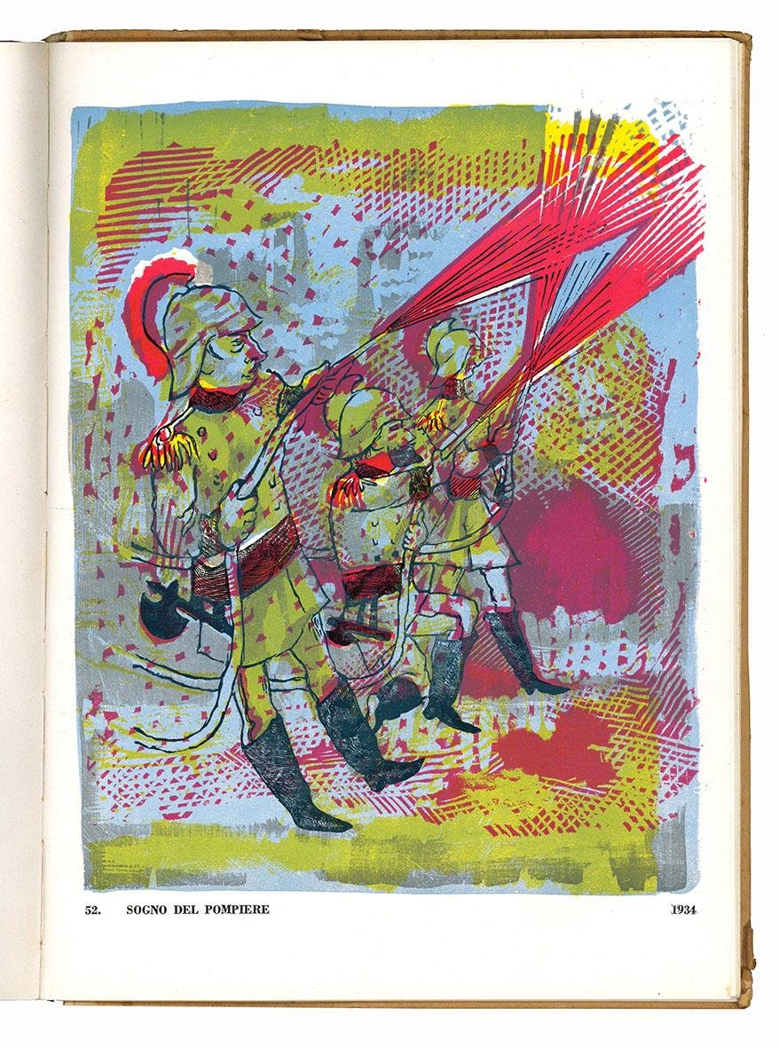 In 4to (mm 340x250); pp. 31, [3] tav. a colori applicate, 63 c. di tav. fuori testo. Testo con numerose illustrazioni in bianco e nero. Tre illustrazioni a colori applicate, sessantatre illustrazioni in bianco e nero e a colori di cui 15 sono linoleum originali a colori. Alcune carte lievemente brunite e fiorite. Mezza tela editoriale con illustrazioni a colori dell'autore ai piatti. Minime mancanze alle cuffie e ai margini dei piatti.