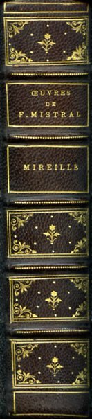 In-16°, pp. VII, (1), 515, raffinata legatura coeva in m. pelle marrone con titolo, fiorellini, filetti e decori fitomorfi su dorso a nervetti decorati in oro. Piatti marmorizzati, taglio di testa dorato, risguardi decorati a piuma di pavone, segnacolo. Ritratto di Mistral all'acquaforte all'antiporta. Regole sulla pronuncia del provenzale in principio. Alle pp. 509-510, notazione musicale di 'Magali. Mélodie provençale populaire transcrite par Fr. Séguin'. Condizioni perfette. Elegantissima edizione del capolavoro del grande poeta felibrista, premio Nobel per la letteratura nel 1906. Testo originale provenzale con traduzione francese a fronte. Delicatissimo poema in 12 canti, 'Mireille' è l'opera più significativa dell'intero Felibrismo e al suo apparire, nel 1859, venne premiato dall'Académie Française e altamente elogiato da Lamartine, che vide nel libro la rinascita della poesia epica antica (Mistral stesso 'umilissimo scolaro del grande Omero').