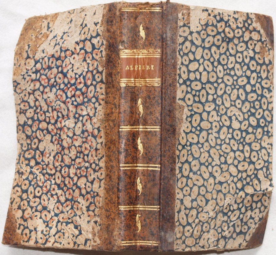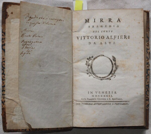 In 8. Dim. 20x12,5 cm. Pp. 82, 80, 80, 88+(2), 84, 80. Interessante volume, una raccolta di sei tragedie del drammaturgo, poeta e scrittore Vittorio Amedeo Alfieri (1749-1803) tutte pubblicate nel 1792. Le sei tragedie hanno frontespizio a sè stante (tranne Agamennone, presente solo l'occhietto) e sono complete di tutte le pagine. All'interno presenti Bruto Primo (prima ed. 1789), Mirra (prima ed. 1789), Agamennone (prima ed. 1783), Saul (prima ed. 1782), Ottavia (prima ed. 1783), Agide (prima ed. 1788). Indice manoscritto alla prima carta bianca e note all'interno. In discrete condizioni. Rara raccolta. Copertina in mezza pelle coeva con titolo e decorazioni in oro al dorso in discrete condizioni generali con lievi usure ai margini e dorso; rotture e deformazioni ai piatti. Legatura in buone condizioni. All'interno le pagine si presentano in buone condizioni con fioriture. Corpo del libro deformato. Interesting volume, a collection of six tragedies by the dramawriter, poet and writer Vittorio Amedeo Alfieri (1749-1803) all published in 1792. The six tragedies have their own title page (excepting for Agamennone, there is only the false title page) and are complete of all pages. Inside there are Bruto Primo (first ed. 1789), Mirra (first ed. 1789), Agamennone (first ed. 1783), Saul (first ed. 1782), Ottavia (first ed. 1783), Agide (first ed. 1788). Manuscripted index in the first white page and notes inside. In fair conditions. Scarce collection. Half leather cover with golden title and decorations in the spine in fair general conditions slightly worn in the edges and spine; cracks and bad shape in the plates. Binding in good conditions. Inside pages are in good conditions with foxings. The body of the book with bad shape.