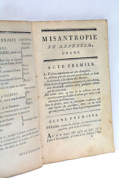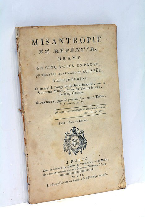 Misantropie et Repentir, drame en cinq actes, en prose, traduit par Bursay. Et arrangé à l’usage de la scène française par la Citoyenne Molé, Artiste du Théâtre Français, faubourg Germain. Représenté pour la première fois, sur ce Théâtre, le 7 nivôse, an 7.