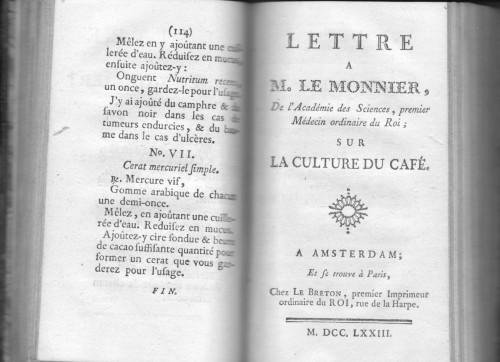 Miscellanea che comprende: Méthode nouvelle et facile d'administrer le vif-argent aux personnes attaquées de la maladie vénérienne. On y a joint une hypothèse nouvelle sur l'action de ce métal dans les voies salivaires, ouvrage traduit du latin de M. Plenck (1768) - Lettre a M. Le Monnier, de l'Academie des Sciences, premier Medecin du Roi, sur LA CULTURE DU CAFE' (prima ediz.) - Observations sur le cacao et le chocolat ., suivies De Réflexions sur le Système de M. de Lamure, touchant le battement des Artères
