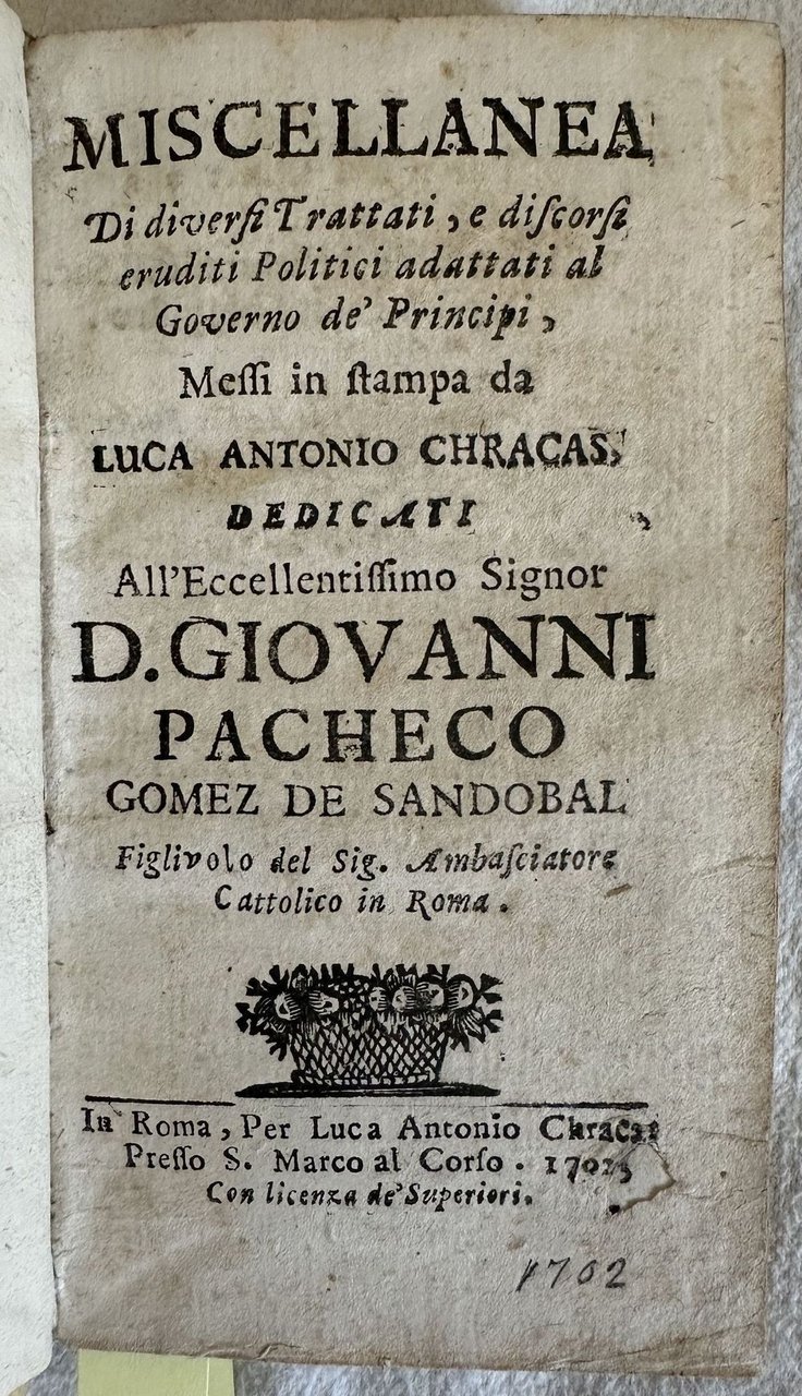 Prima edizione del 1702 di questa rara opera di carattere politico edita da Luca Antonio Chracas (ca 1658-1723) stampatore romano. Dedica a Don giovanni Pacheco Gomez de Sandobal figlio dell'ambasciatore cattoico a Roma. L'opera contiene una serie di scritti e discorsi per la buona preparazione, comportamento e buon governo di un principe o ministro. In ottime condizioni. Copertina in piena pergamena coeva con titolo manoscritto al dorso in ottime condizioni generali con lievi usure ai margini e dorso. Legatura in buone condizioni. All'interno le pagine si presentano in buone condizioni con rare fioriture. In 16. cm 15x9. Pp. (4)+299+(3). First edition of 1702 of this scarce work of policy edited by Luca Antonio Chracas (ca 1658-1723) roman editor. Dedication to Don giovanni Pacheco Gomez de Sandobal son of the catholic ambassador in Rome. the work contains a series of speeches and writings for the good preparation, behaviour and good government of a prince and minister. In very good conditions. Full parchment coeval cover with handwritten title in the spine in very good conditions lightly worn in the extremities. Binding in good conditions. Pages in good conditions with occasional foxing. In 16. cm 15x9. Pp. (4)+299+(3).